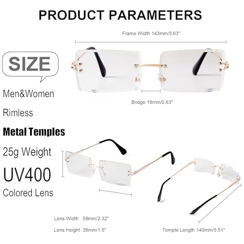 • Fashion Rimelss Rectangle Sunglasses: These retro clear sunglasses for women men are featuring with stylish gold metal frame, makes these sunnies look delicate and chic, classic and vivid colors can go well with your different daily clothes and party costumes, making you more elegant and attractive