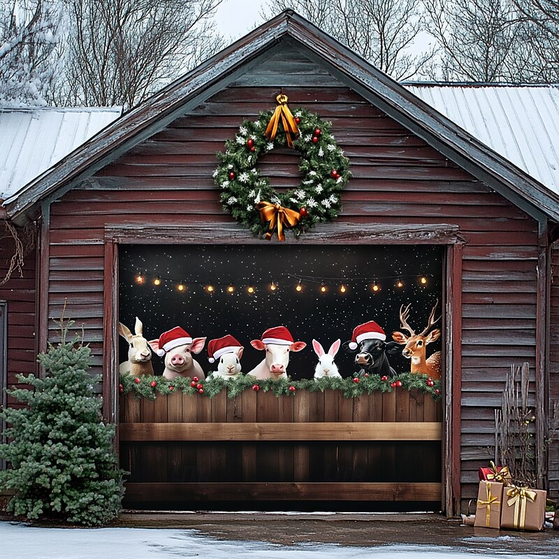 Christmas Door Decorations Outdoor Garage Door Cover Xmas Banner Farmhouse Animals Large Christmas Backdrop for Holiday Outdoor Garage Door Home Wall Decorations
