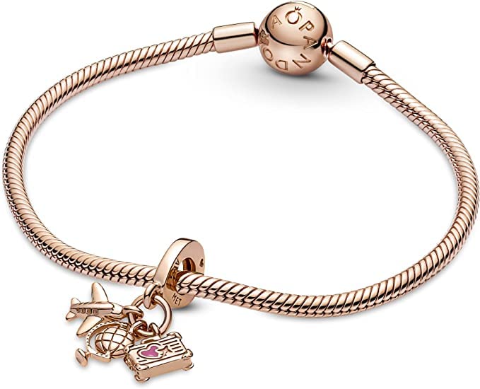 • Rose Gold Bracelet Charm: Fly away on a dream adventure with this 14k rose-gold plated travel charm; it features an airplane, a globe, and a suitcase with lifelike corner details and a tiny pink enamel heart