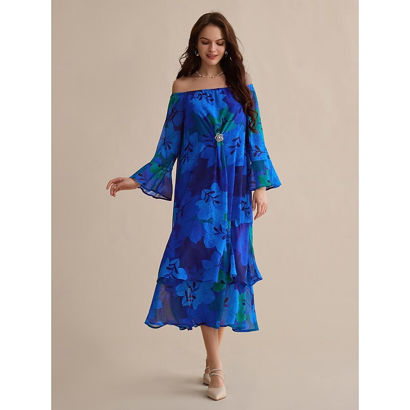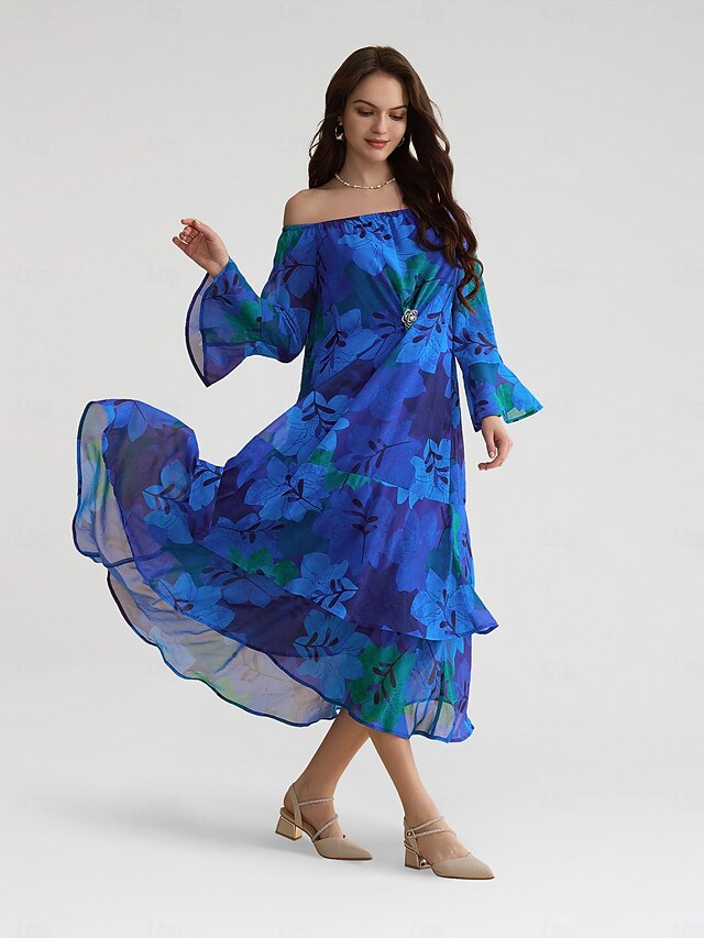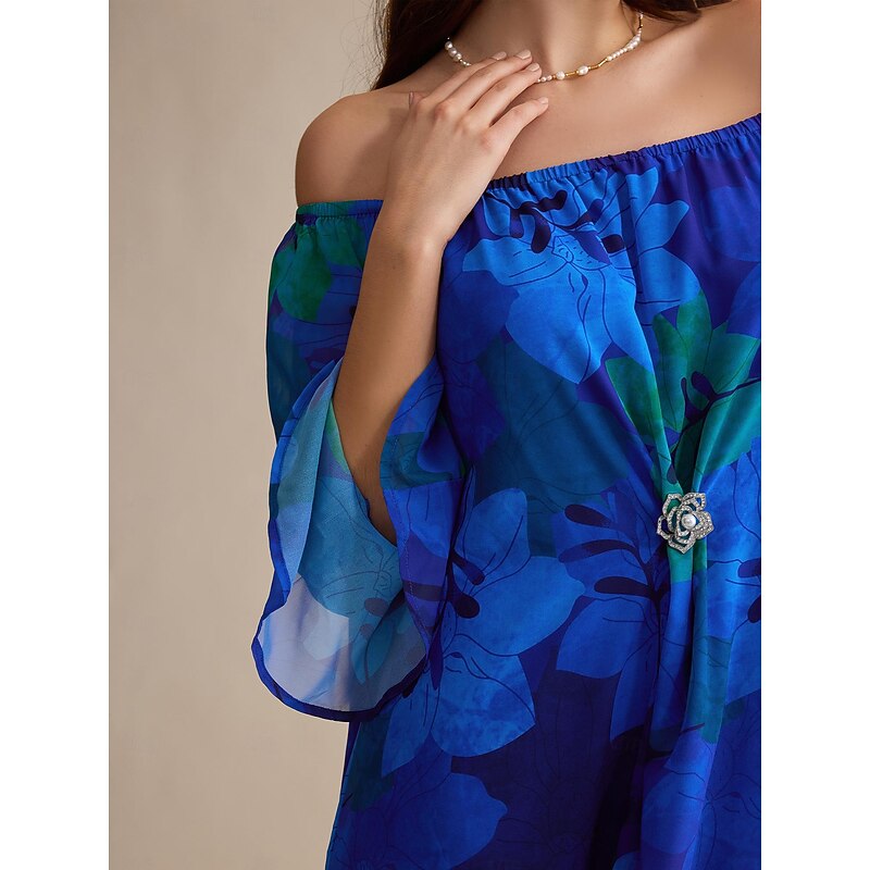 More information about Chiffon Wedding Guest Royal Blue Floral Off Shoulder Long Sleeve Maxi Dress