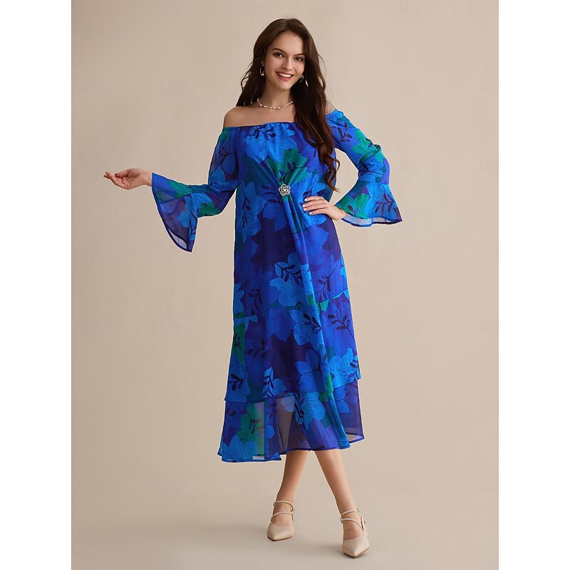 HOT ! Chiffon Wedding Guest Royal Blue Floral Off Shoulder Long Sleeve Maxi Dress