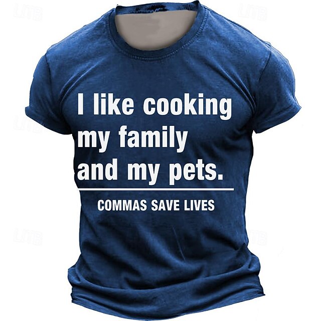 : This t-shirt features a witty graphic with bold white text reading, "I like cooking my family and my pets. Commas save lives," humorously emphasizing the importance of punctuation. The 3D print gives it a unique and eye-catching appearance.