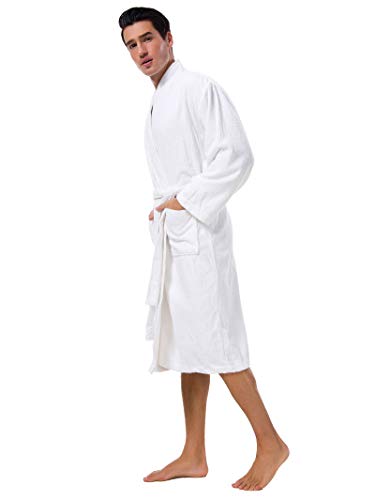 SIORO Mens Robes Terry Cloth Kimono Bathrobe Cotton Towel Bath Robe Soft Shower Spa Hotel Hot Tub Calf Length Long Sleepwear, Pure White Large 7