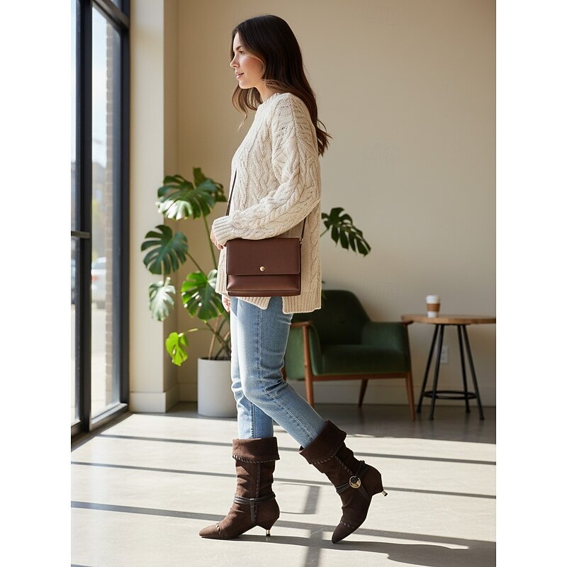 Women's Mocha Brown Suede Mid-Calf Boots with Braided Strap Detail, Fold-Over Design and Kitten Heels, Urban Casual Fashion Footwear for Women's Everyday Streetwear 1