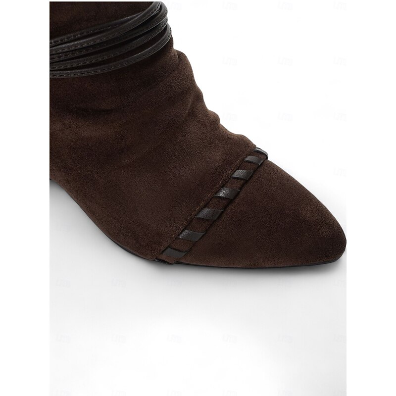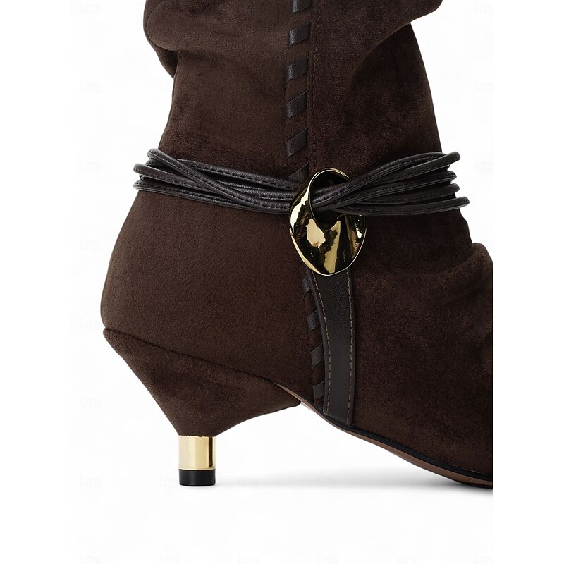 Women's Mocha Brown Suede Mid-Calf Boots with Braided Strap Detail, Fold-Over Design and Kitten Heels, Urban Casual Fashion Footwear for Women's Everyday Streetwear 14