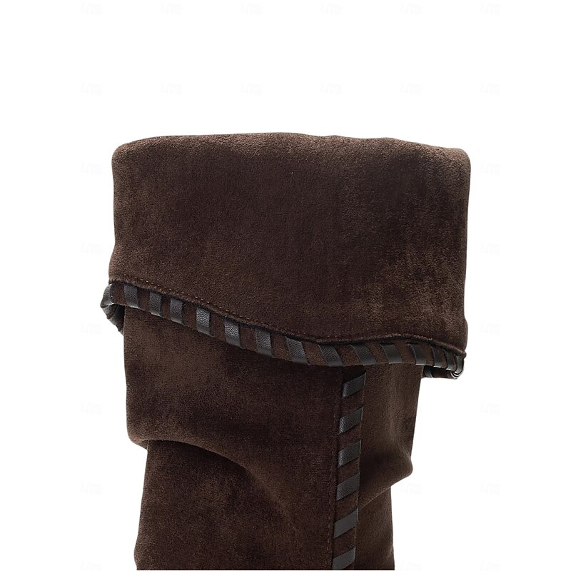 Women's Mocha Brown Suede Mid-Calf Boots with Braided Strap Detail, Fold-Over Design and Kitten Heels, Urban Casual Fashion Footwear for Women's Everyday Streetwear 12