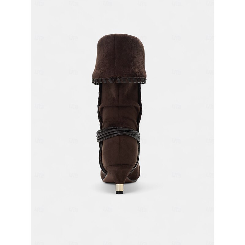 Women's Mocha Brown Suede Mid-Calf Boots with Braided Strap Detail, Fold-Over Design and Kitten Heels, Urban Casual Fashion Footwear for Women's Everyday Streetwear 13