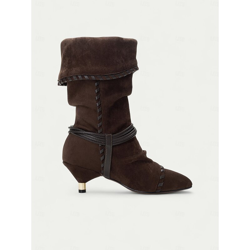 More information about Women's Mocha Brown Suede Mid-Calf Boots with Braided Strap Detail, Fold-Over Design and Kitten Heels, Urban Casual Fashion Footwear for Women's Everyday Streetwear