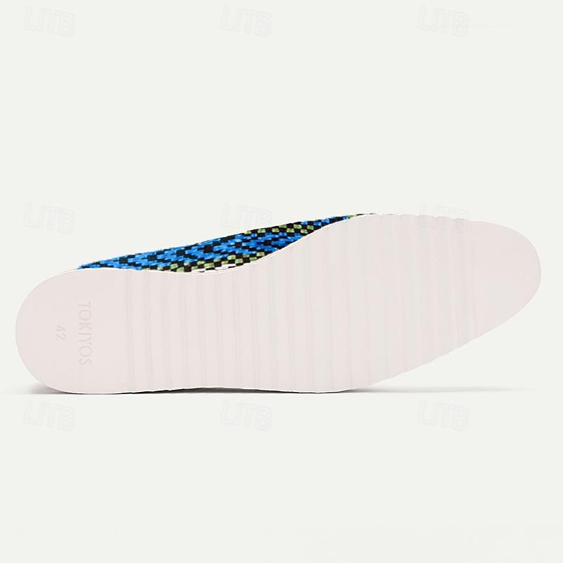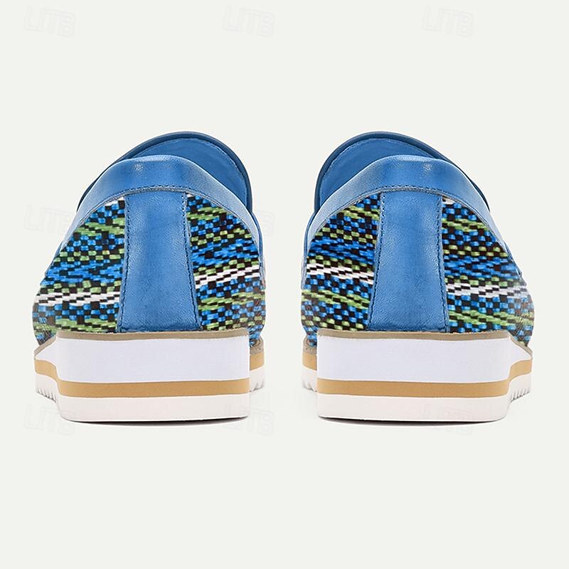 Highlights [Fabric] Crafted from premium Italian full-grain cowhide, these slip-on loafers feature a stylish woven nylon upper, blending traditional leather with contemporary woven fabric. The upper provides a colorful, vibrant pattern that includes shades of blue, green, and white, creating a visually striking effect. [Fit] Designed with a round toe shape, these loafers offer a comfortable fit ideal for all-day wear. The interior is lined with soft leather, ensuring a cushioned and supportive insole that adapts to the foot's shape for extended comfort. [Design Highlights] The loafers boast sleek blue leather accents, enhancing their elegance and adding a modern twist. The outsole is crafted from durable EVA material, featuring a contrasting white and tan color scheme that provides reliable grip and stability. [Occasions] Perfect for casual outings or semi-formal events, these loafers are versatile enough to complement a variety of outfits. Suitable for those who appreciate a blend of traditional craftsmanship and contemporary style, they are an ideal choice for elevating any wardrobe. [Size Range] Available in sizes US8 to US12 (EU41 to EU45, UK7 to UK11), these loafers accommodate a range of foot sizes, ensuring a suitable fit for different wearers.