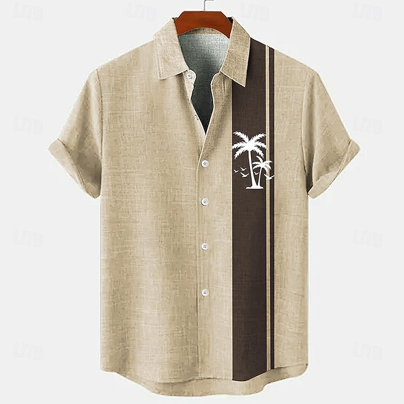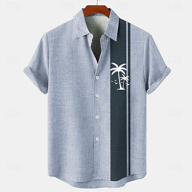 Highlights [Fabric] : Crafted from a blend of 20% linen, 20% cellulose, and 60% polyester, this men's shirt offers a breathable and lightweight feel. The use of recycled fibers highlights an environmentally conscious choice, providing comfort during warm spring and summer days. [Fit] : With a relaxed fit and short sleeves, this shirt is designed to provide ease of movement and casual comfort, making it ideal for leisurely outings and relaxed gatherings. [Design Highlights] : The standout feature of this shirt is its tropical-inspired design, featuring a vertical black stripe with a white palm tree print on the right side of the predominantly striped fabric. The stand collar adds a modern twist to the classic look, ensuring you stand out with style and elegance. [Occasions] : Perfect for a wide range of occasions, this shirt effortlessly transitions from vacation and streetwear to daily casual and outdoor settings. Whether you're heading to the beach, a casual outing, or enjoying a day in the sun, this shirt complements various scenarios with its versatile appeal. [Size Range] : Available in sizes S, M, L, XL, XXL, and XXXL, this shirt offers a range of size options to ensure a comfortable fit for a variety of body types, allowing you to find the perfect size that suits your needs.