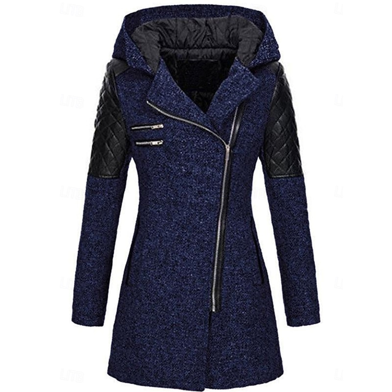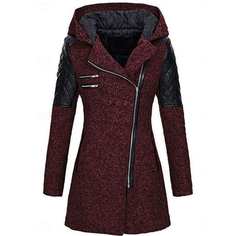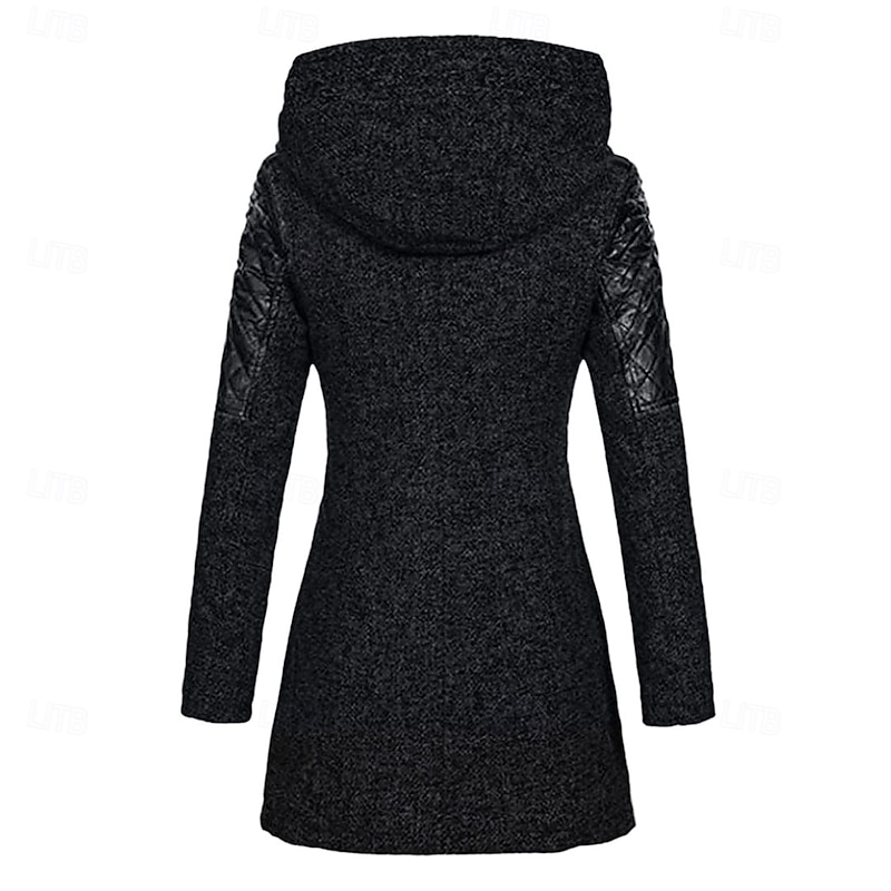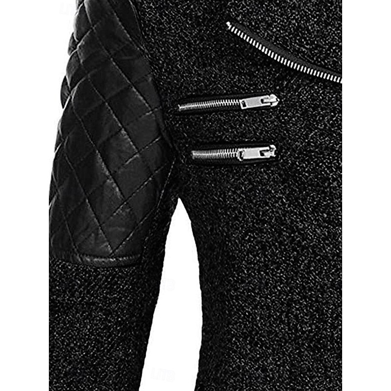 The coat features an asymmetrical zip closure, adding a modern edge to its classic design. A spacious hood and lapel neckline offer additional protection against the cold, while the quilted faux leather panels on the sleeves enhance its stylish and edgy look. Functional pockets provide practical storage without compromising on design.