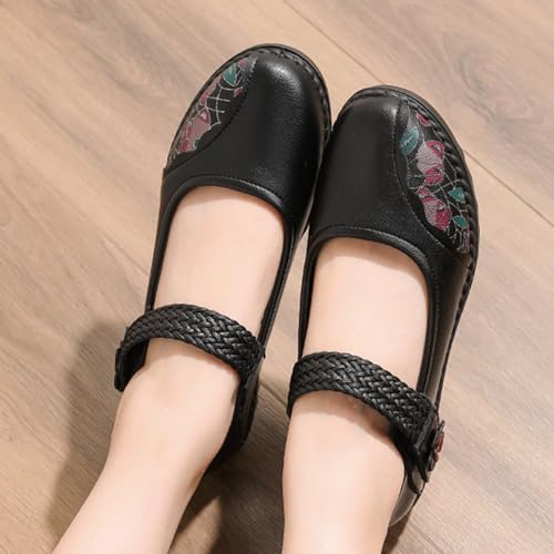 Women's Casual Leatehr Embroidery Mary Jane Flats Shoes,Comfort Round Toe Woven Hook & Loop Soft-Soled Walking Shoes,Lightweight Breathable Lug Sole Dance Shoes 1