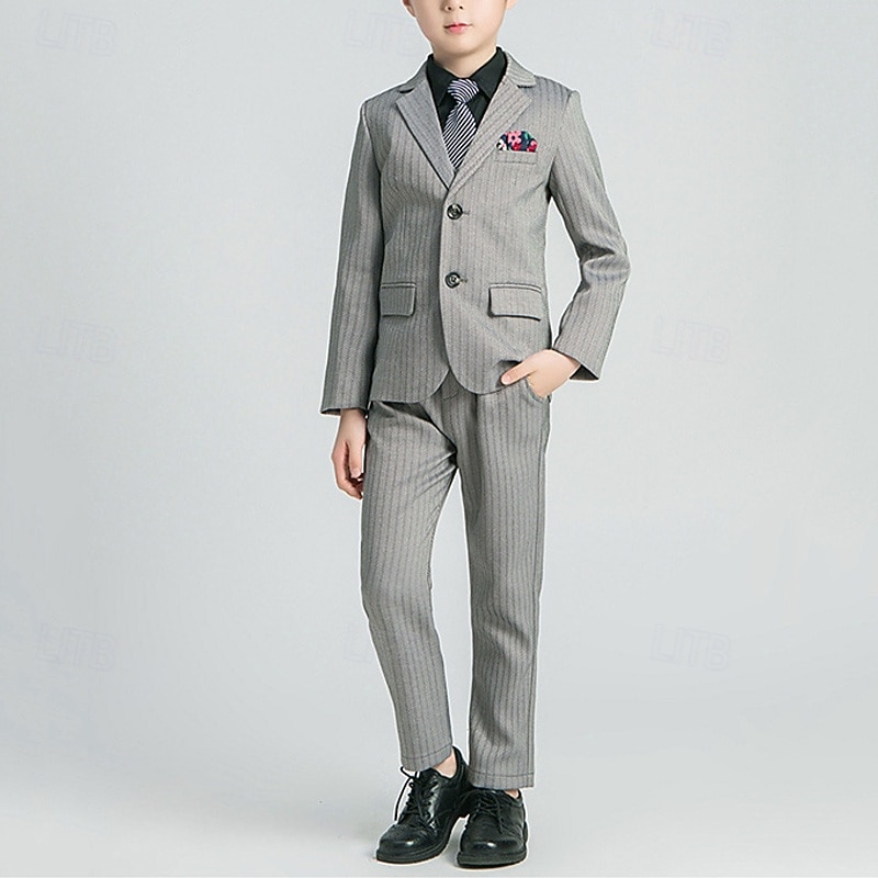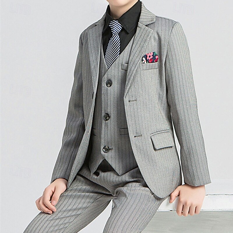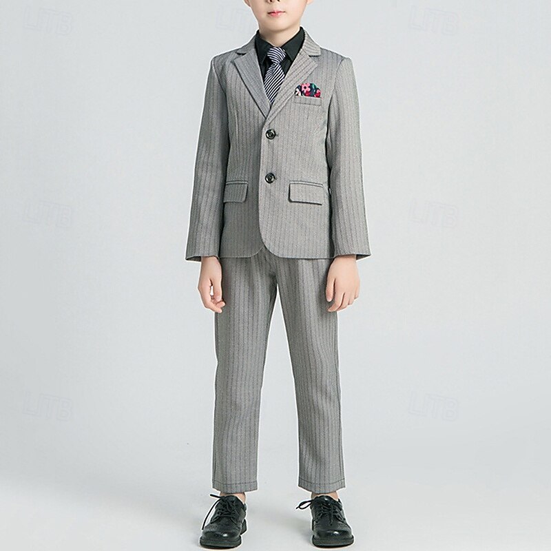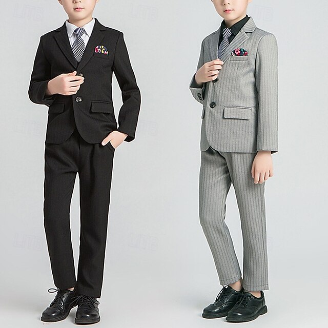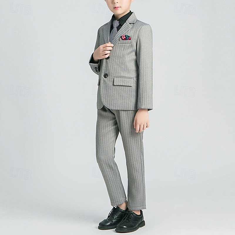 4 Pieces Ring Bearer Suit Boys Kids Suit Formal Suit Blazer & Vest & Pants & Tie Formal Party Valentines Fashion Cool Stripe Pocket Black Gray Polyester 13