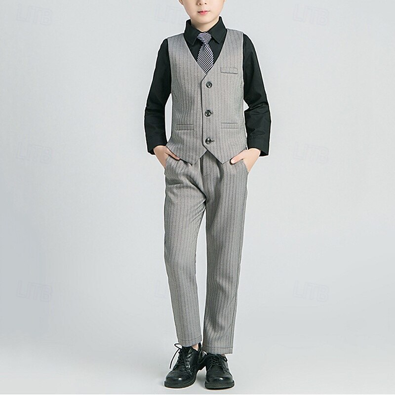 4 Pieces Ring Bearer Suit Boys Kids Suit Formal Suit Blazer & Vest & Pants & Tie Formal Party Valentines Fashion Cool Stripe Pocket Black Gray Polyester 4