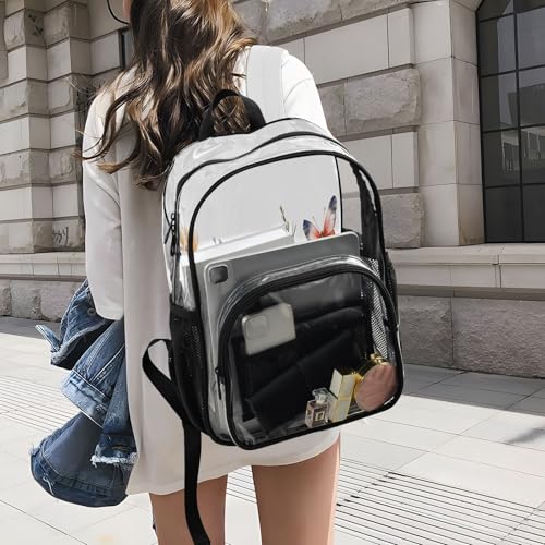 • Spacious & Organized Design – Measuring 10.6" x 5.1" x 15.7", this clear bookbag features a large main compartment for magazines/books, a front mesh pocket for pens/pencil cases, and two side mesh pockets for water bottles or umbrellas—keeping essentials secure and visible.