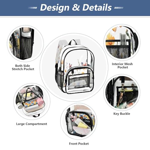 HOT ! Wild Flowers and Butterflies Clear Backpack - Stadium Approved Large 15.7-inch Waterproof Transparent Bag for Sports, Concerts, Work, Travel#172