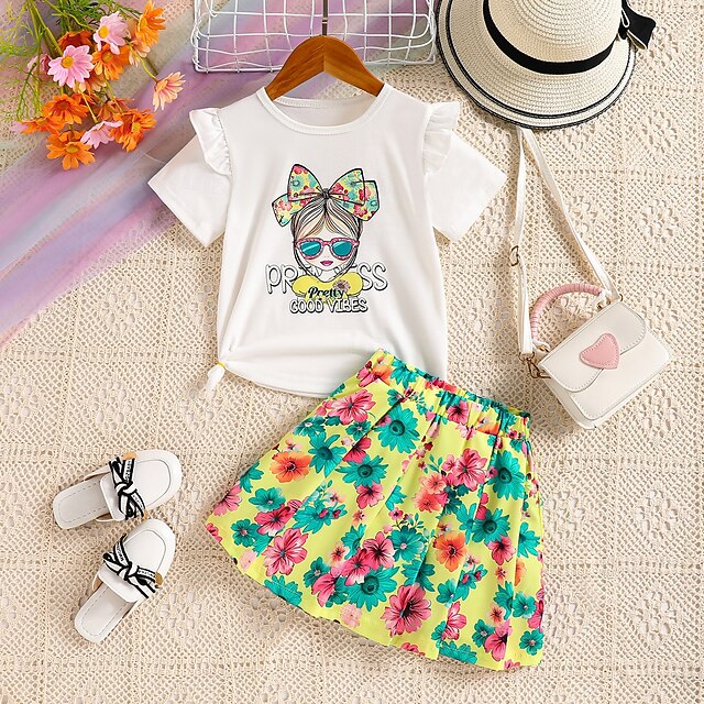 HOT ! 2 Pieces Toddler Girls' Graphic Crewneck Skirt & Shirt Set Short Sleeve Fashion School 4-7 Years Summer White