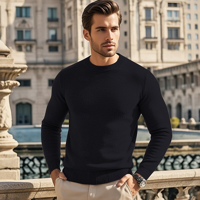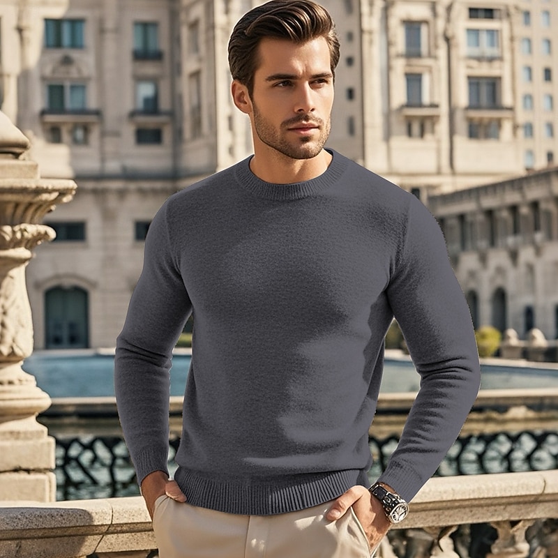 Highlights [Fabric] : Crafted from a premium wool blend, this men's sweater offers exceptional warmth and a soft touch, ideal for the chill of fall and winter. The ribbed knit style adds a textured element to the fabric, providing both comfort and durability. [Fit] : Designed with a regular fit, this sweater provides a classic silhouette that's neither too tight nor too loose, offering a comfortable wear while still highlighting the wearer's physique. [Design Highlights] : Featuring a timeless crew neck and an optional mock collar, this sweater balances simplicity and modern style. Its plain knit design allows for effortless layering, making it a versatile addition to any wardrobe. [Occasions] : Perfect for a range of settings, this sweater effortlessly transitions from daily casual wear to date nights or vacations. Its adaptable style makes it suitable for both leisurely outings and more polished occasions. [Size Range] : Available in a variety of sizes from S to XL, ensuring a fit for multiple body types. Available colors include Black, Dark Gray, Beige, Light Grey, and Blue, providing options to suit different personal styles.