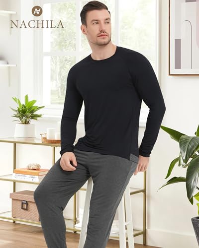 NACHILA Men's Pajamas-Viscose Made from Bamboo,Long Sleeve Pjs silky Pants Pajama Sets Stretchy Sleepwear with Pockets