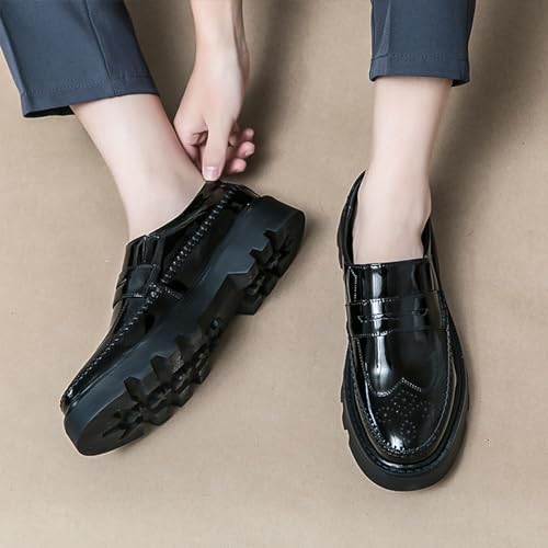 Men's Black Soft Patent Leather Chunky Platform Loafers, Fashionable British Style Brogue Business Casual Formal Shoes, Comfortable Non-Slip Lug Sole Slip-On Penny Loafers 6