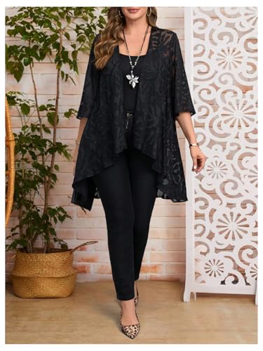 More information about OYOANGLE Women's Plus Size Lace Sheer Open Front Cardigan Lightweight 3/4 Sleeve Ruffle Kimono Outerwear