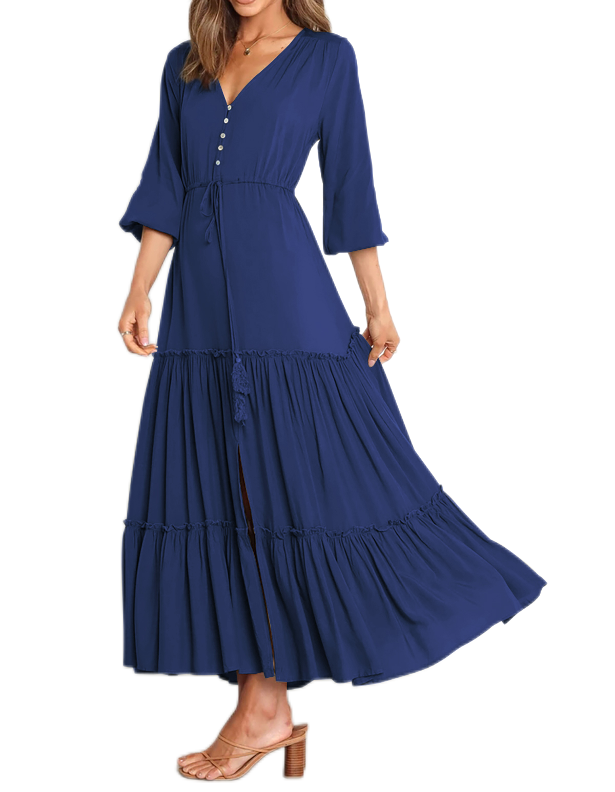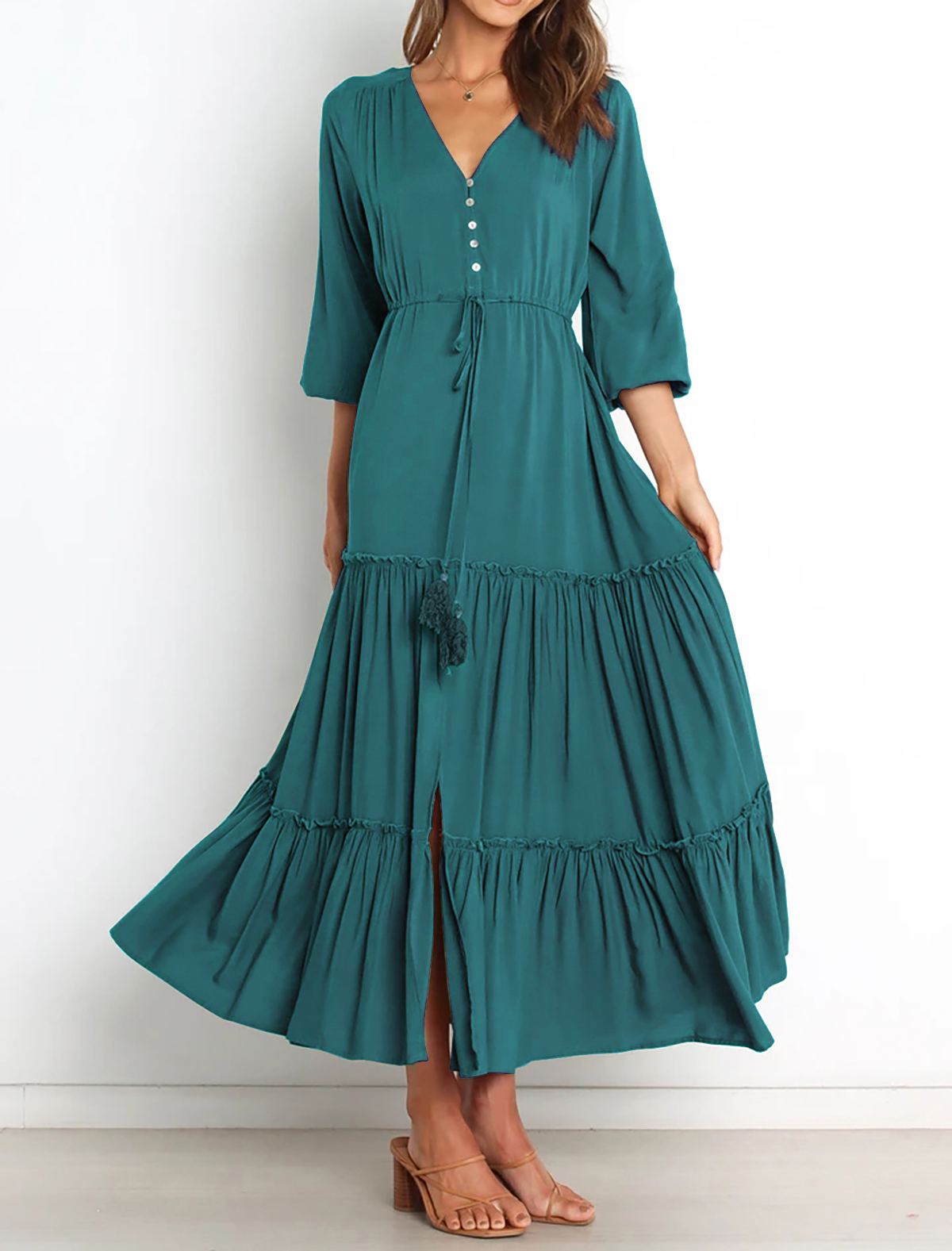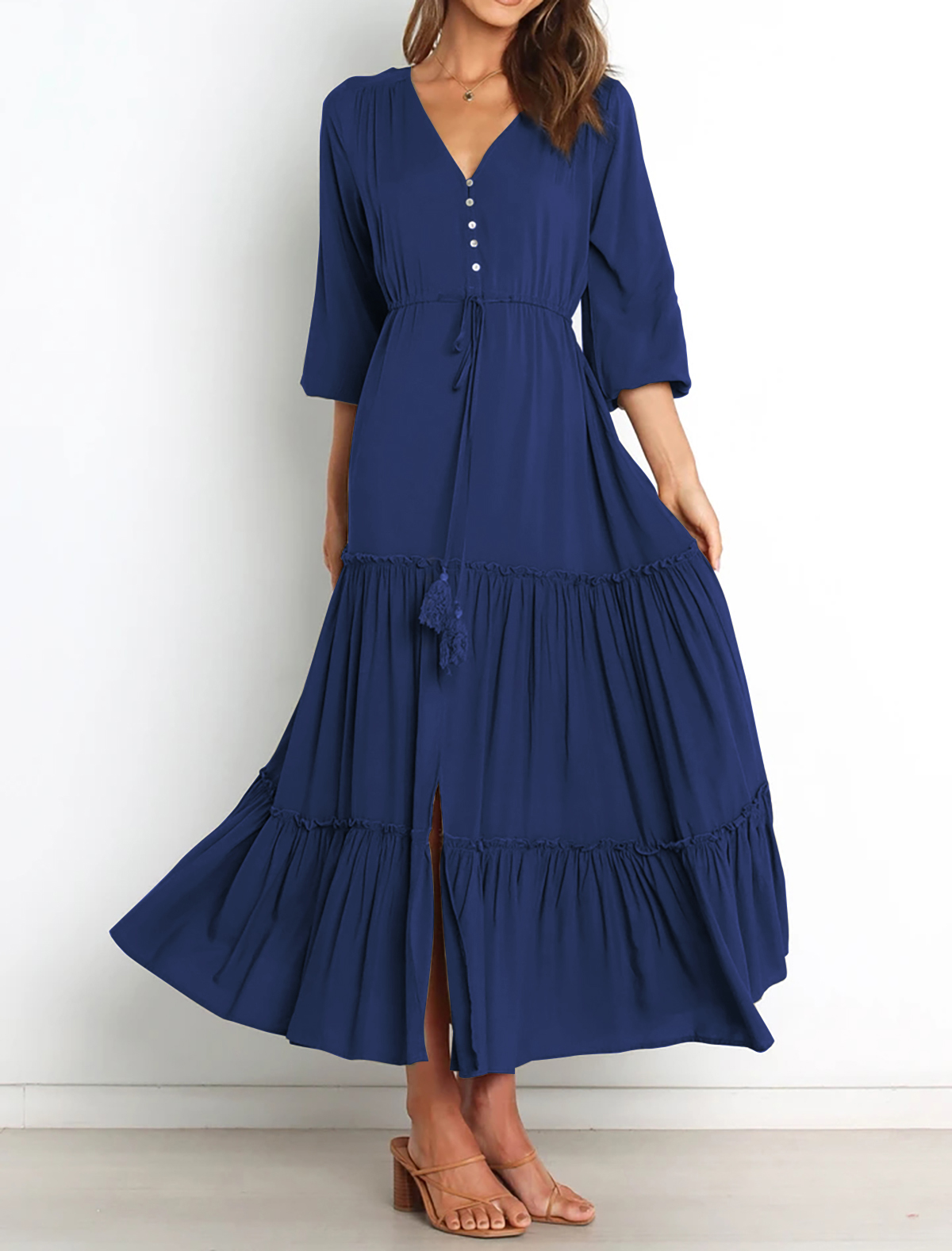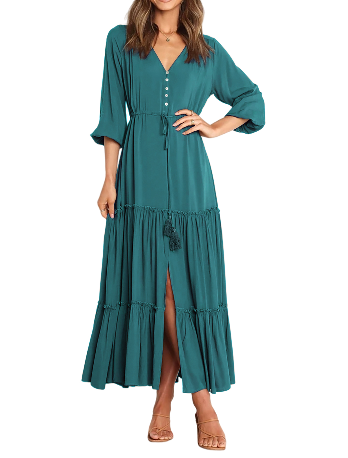 The V Neckline Design Shows A Small Face And The Drawstring Tie At Waist Easy To Create A Form Fitting Waistline, Adding A Feminine Touch. The Tiered Ruffle Maxi Silhouette Keep Up With The Trend While Slit Hem At Front Shows Off Your Long Legs As Your Paces, Nice And Charming!