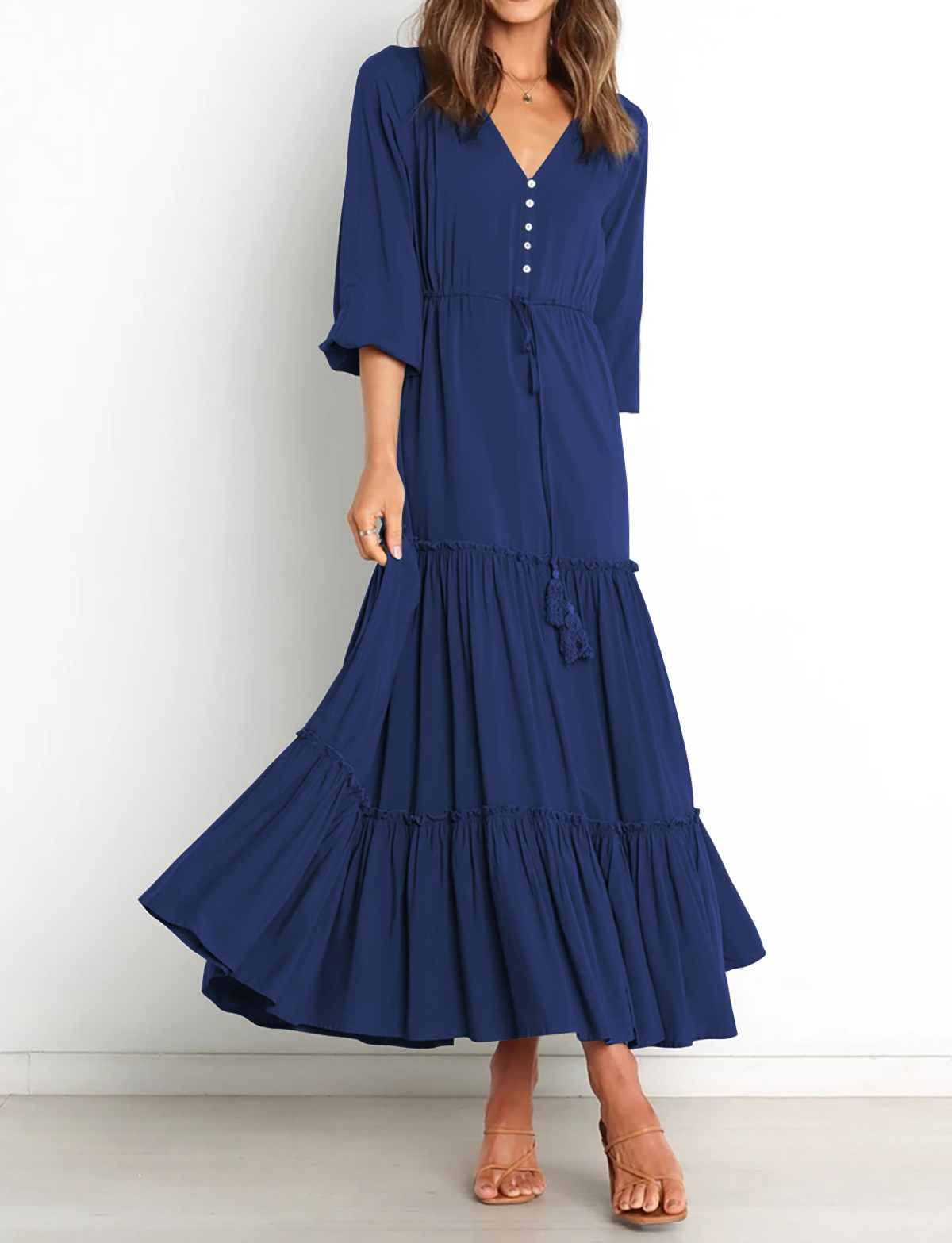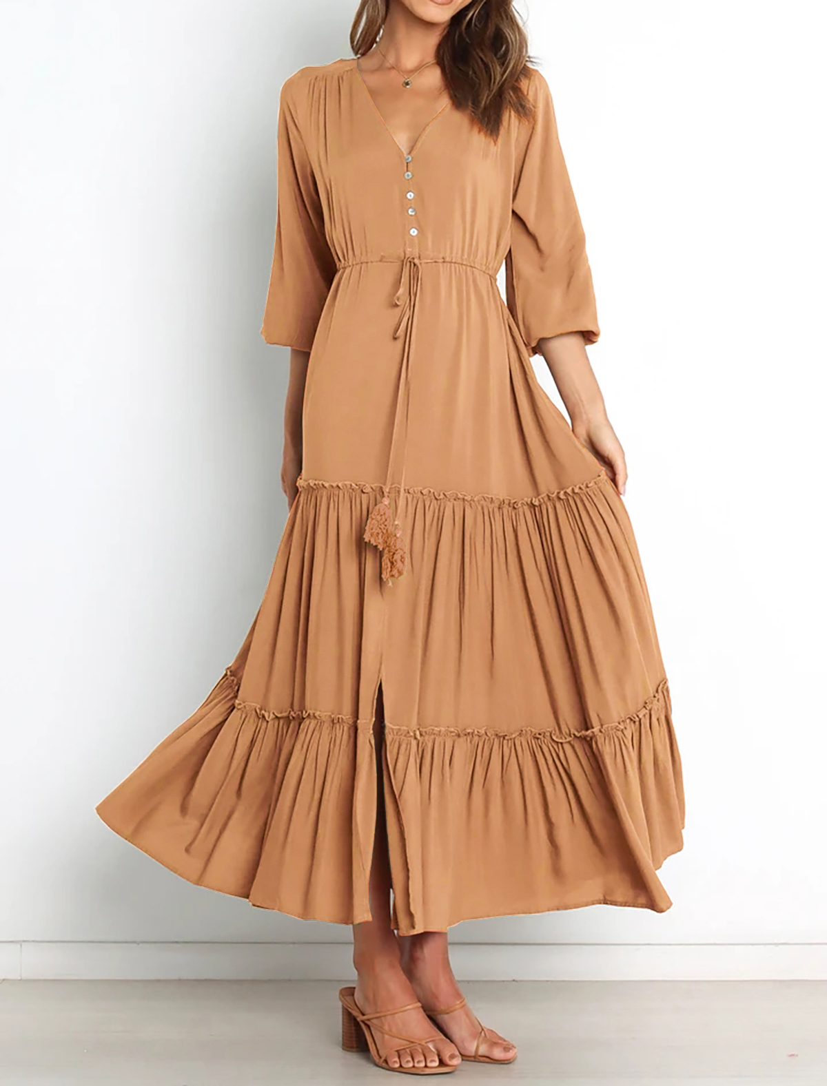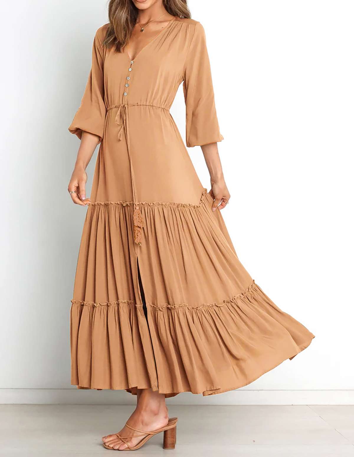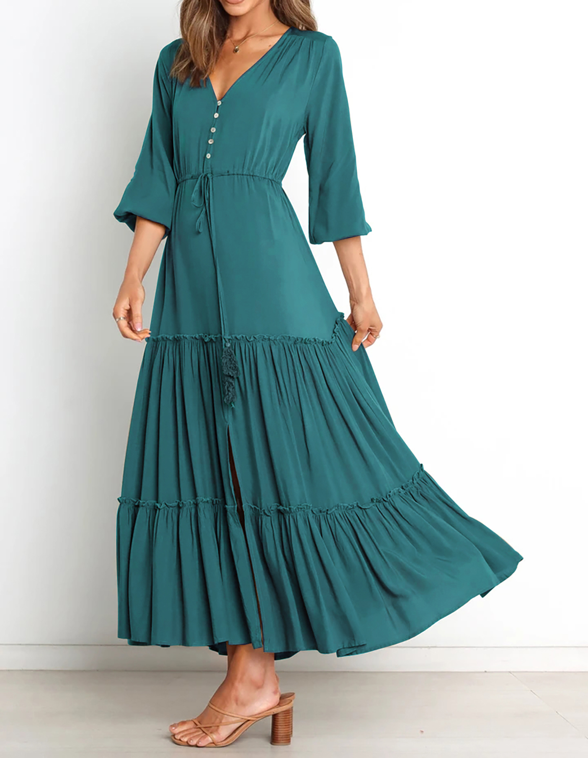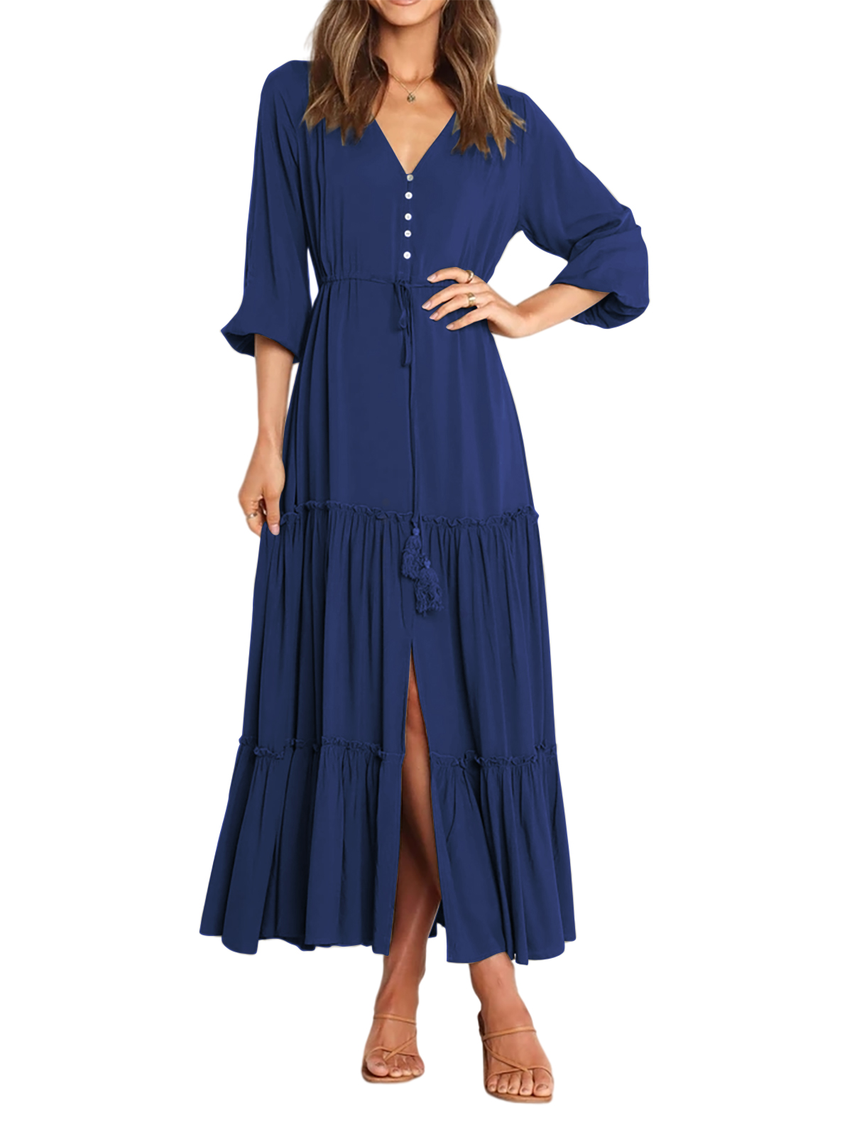 The V Neckline Design Shows A Small Face And The Drawstring Tie At Waist Easy To Create A Form Fitting Waistline, Adding A Feminine Touch. The Tiered Ruffle Maxi Silhouette Keep Up With The Trend While Slit Hem At Front Shows Off Your Long Legs As Your Paces, Nice And Charming!