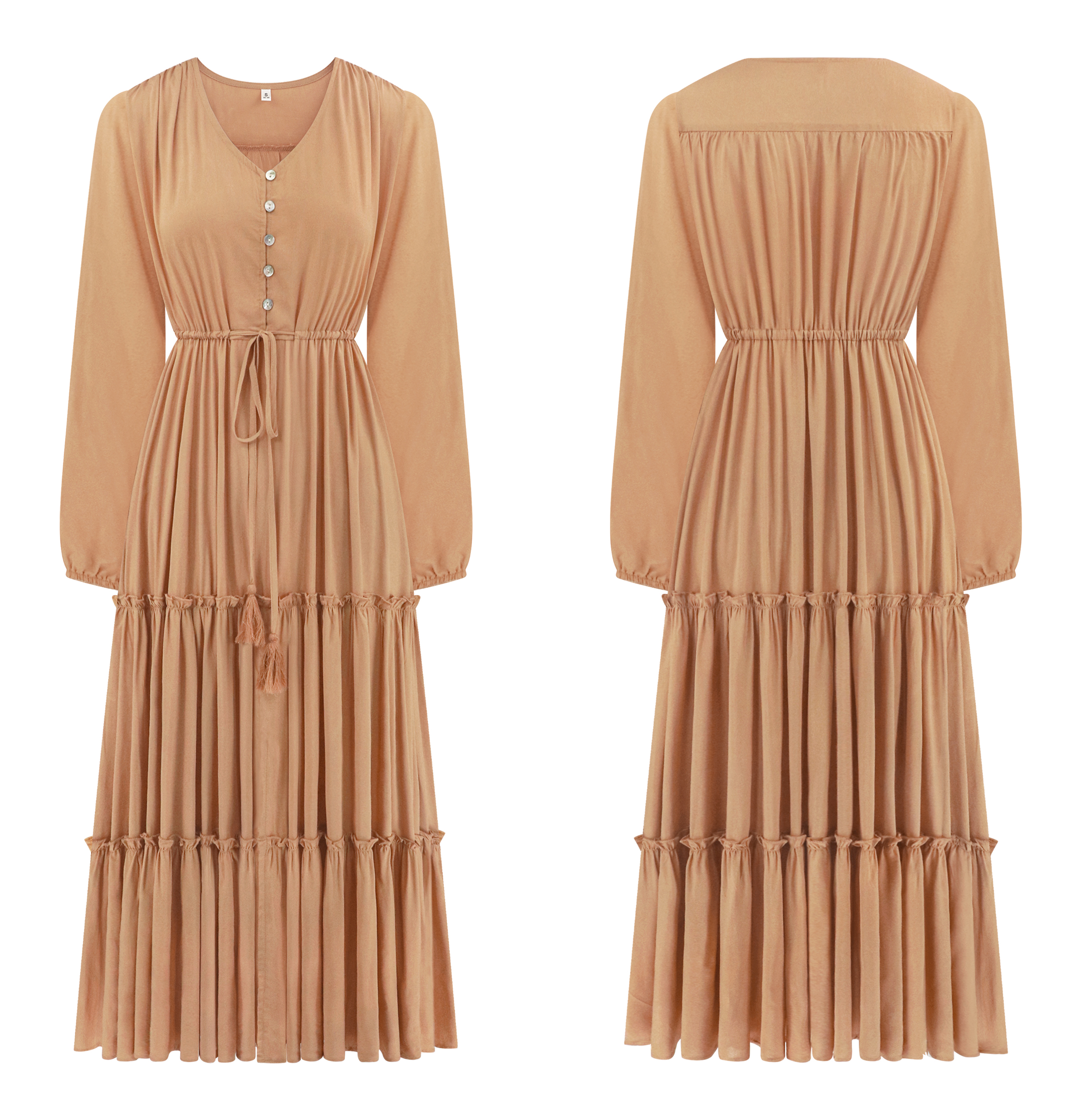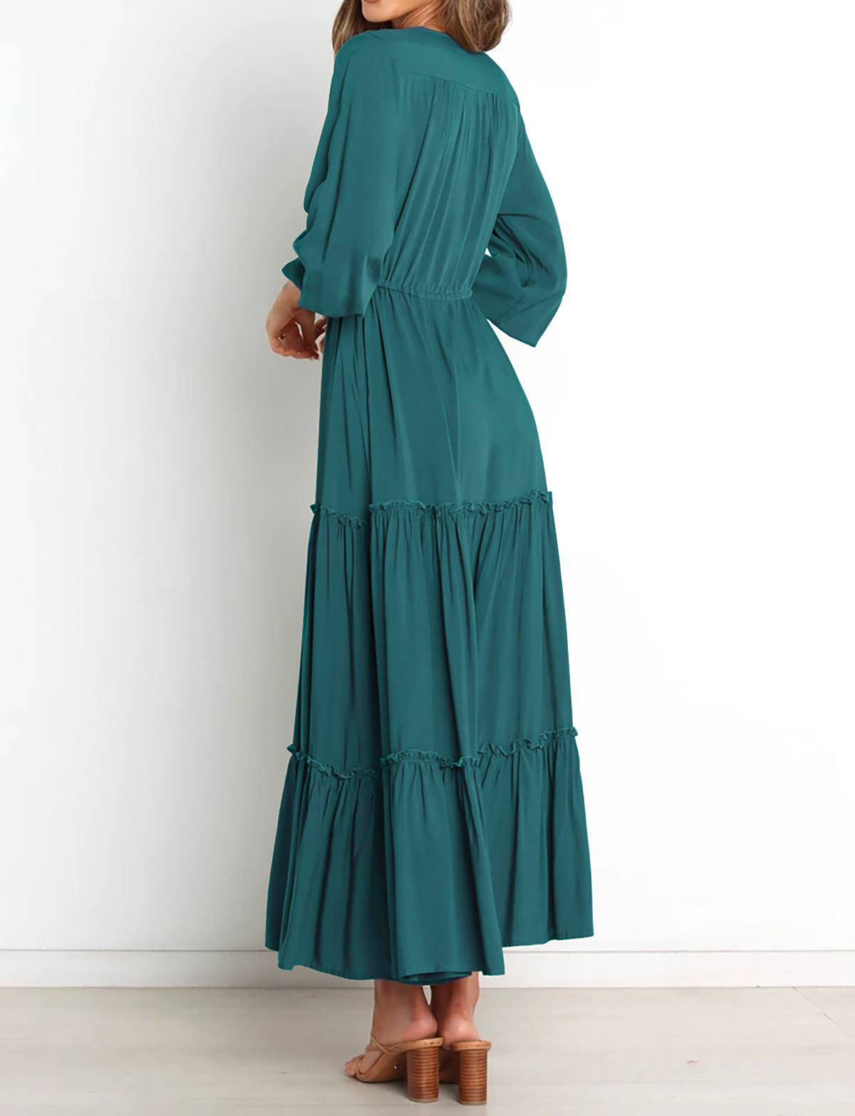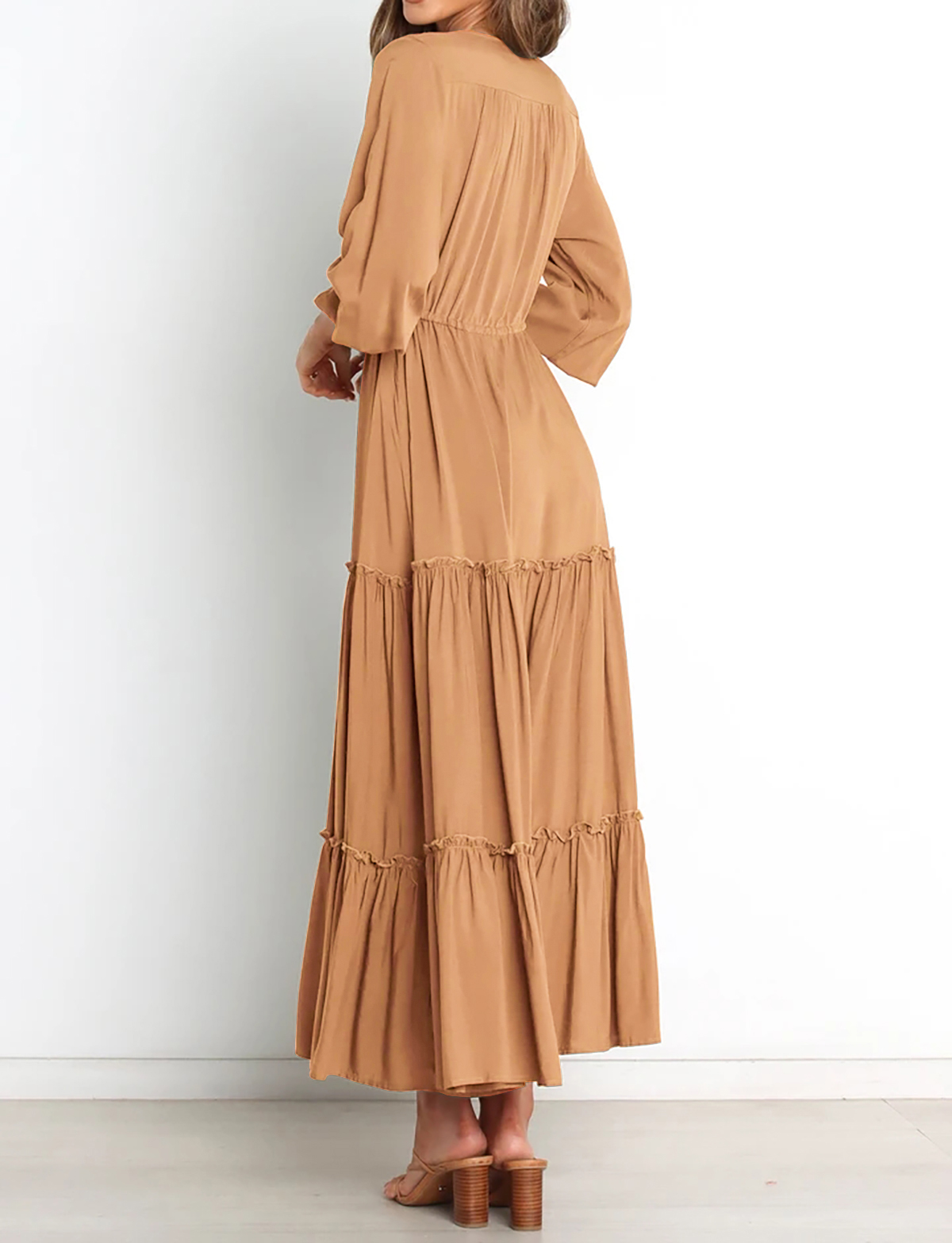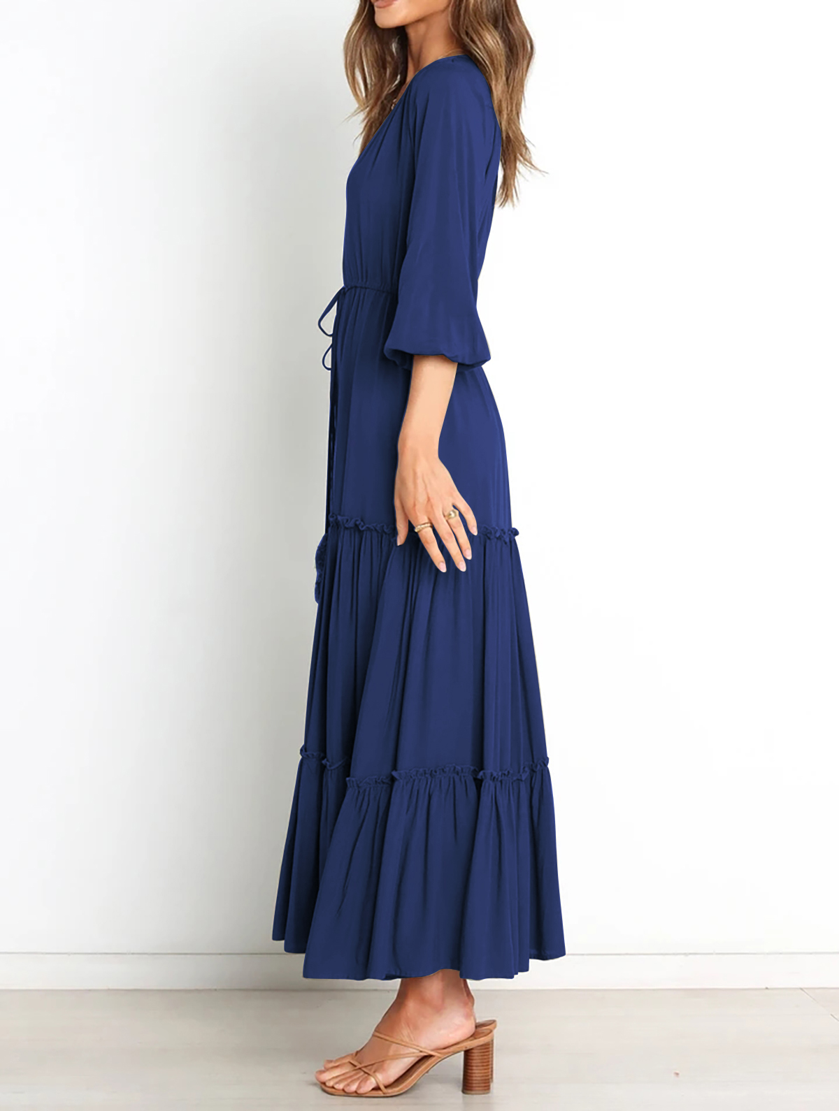 The V Neckline Design Shows A Small Face And The Drawstring Tie At Waist Easy To Create A Form Fitting Waistline, Adding A Feminine Touch. The Tiered Ruffle Maxi Silhouette Keep Up With The Trend While Slit Hem At Front Shows Off Your Long Legs As Your Paces, Nice And Charming!