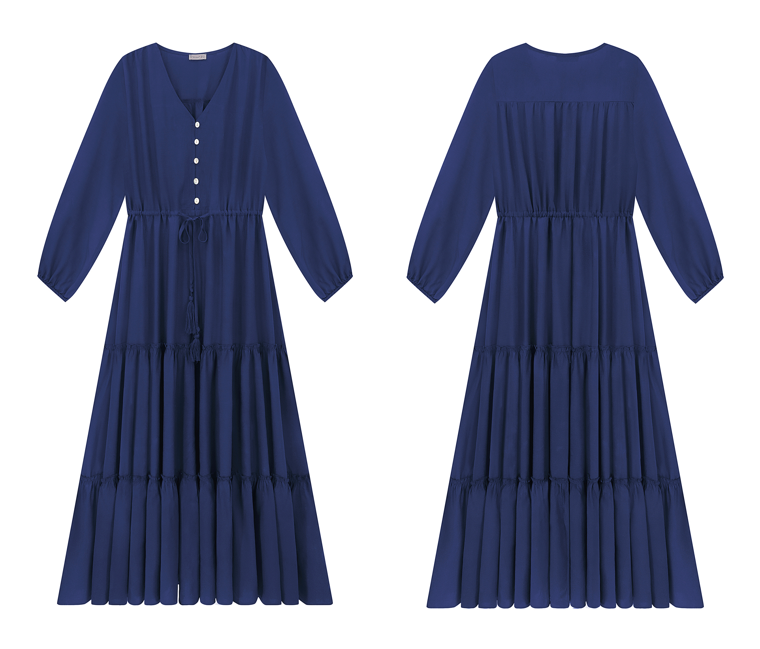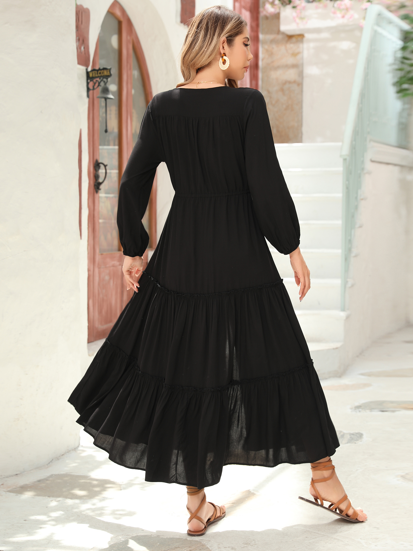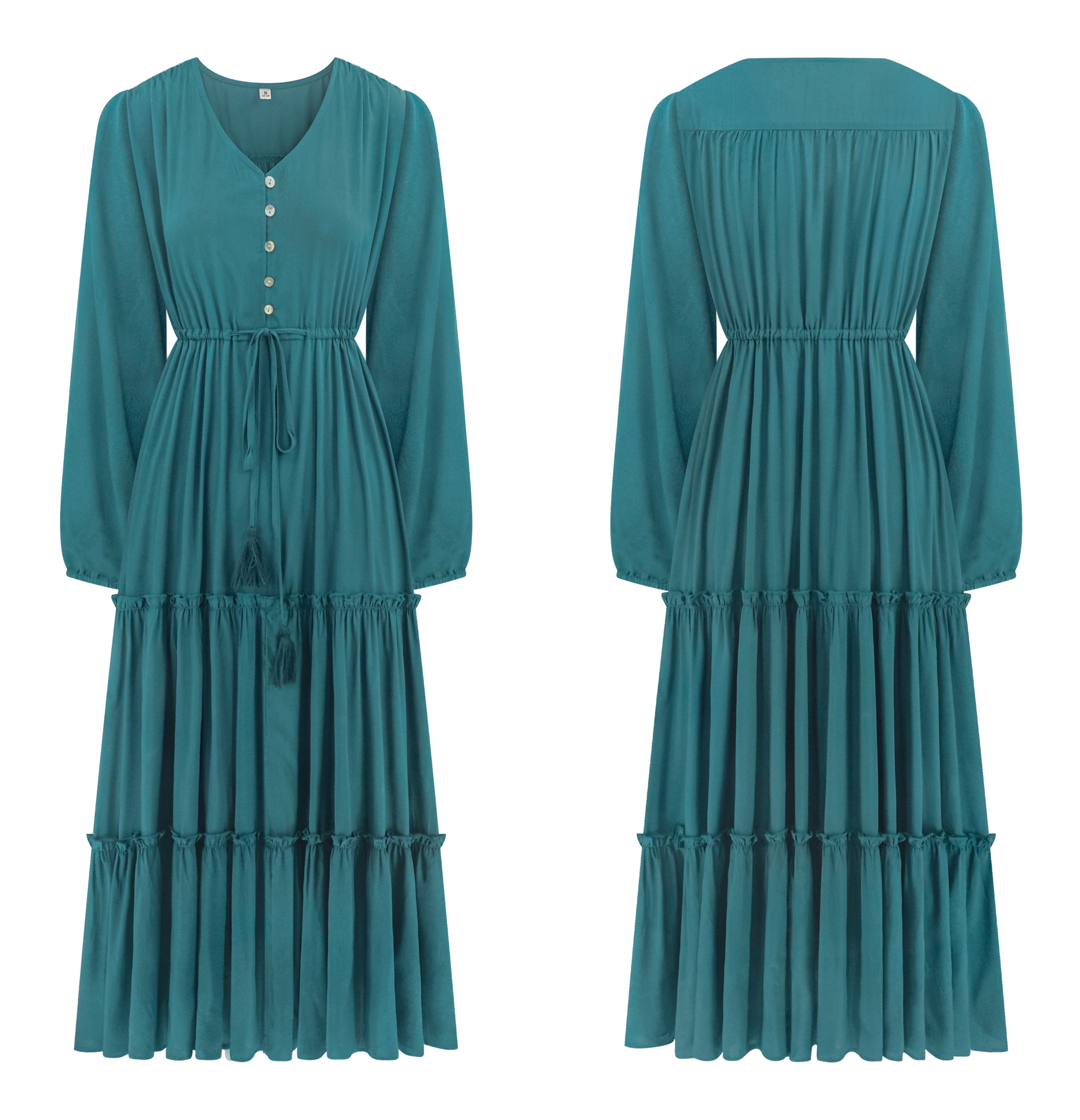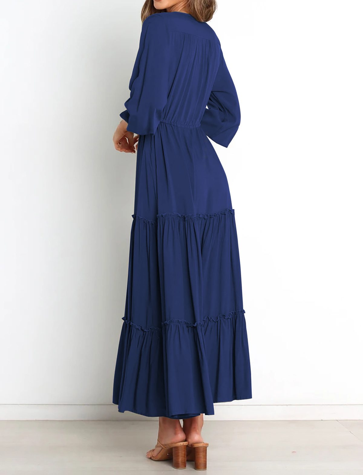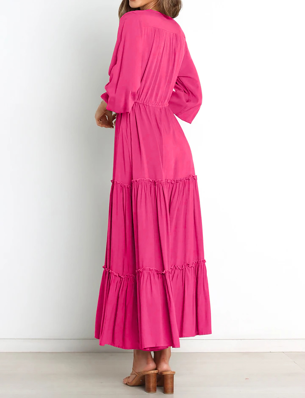 The V Neckline Design Shows A Small Face And The Drawstring Tie At Waist Easy To Create A Form Fitting Waistline, Adding A Feminine Touch. The Tiered Ruffle Maxi Silhouette Keep Up With The Trend While Slit Hem At Front Shows Off Your Long Legs As Your Paces, Nice And Charming!
