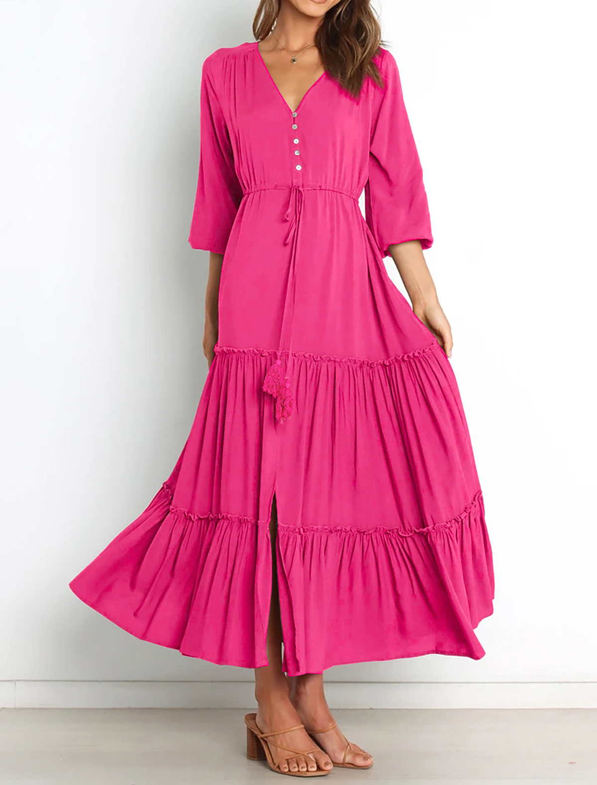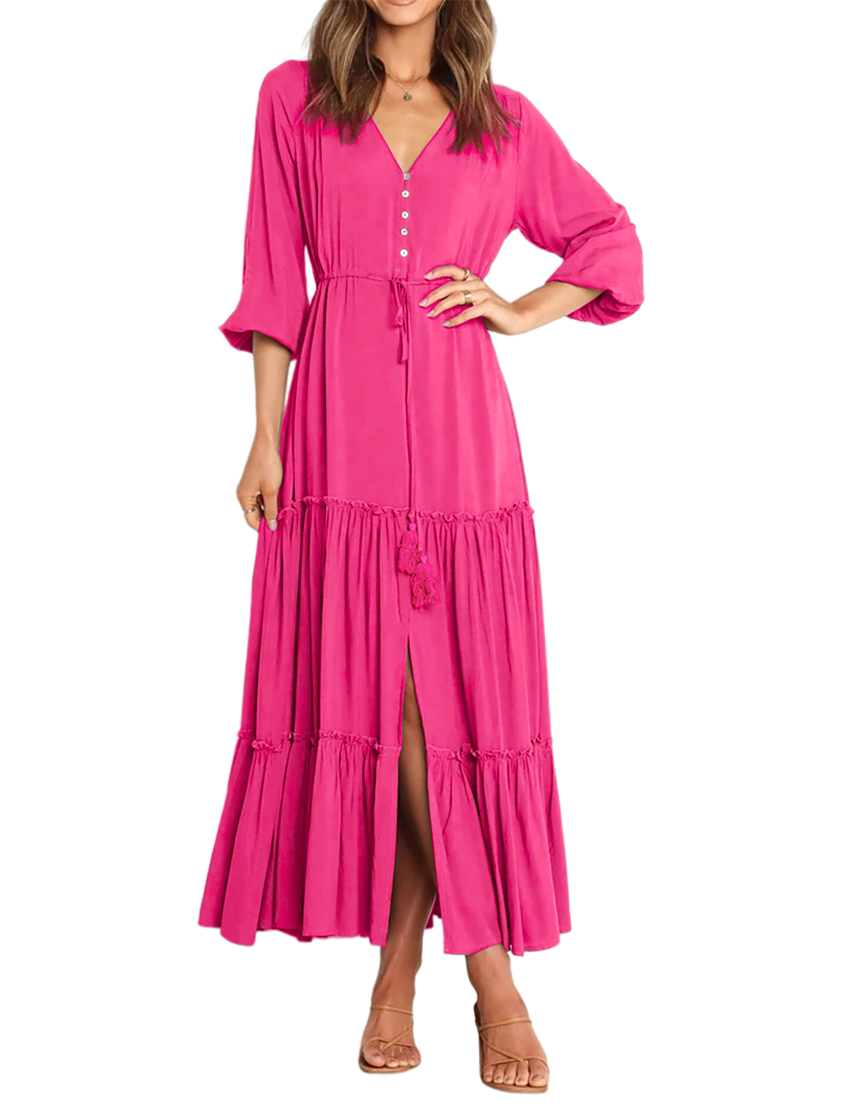 Whether It's Floral Dresses Or Solid Color Dresses, They Are So Casual And Dressy. The Rich Floral Print Pattern Lend To The Dress A Bohemian flair, Saturated Solid Color Is Simple But Still Enough Dressy. This Tiered Ruffle Slit Maxi Dress Can Be Flattering On Different Body Types!