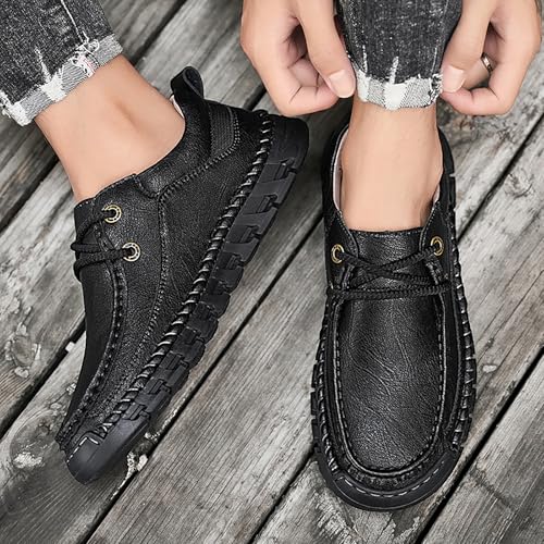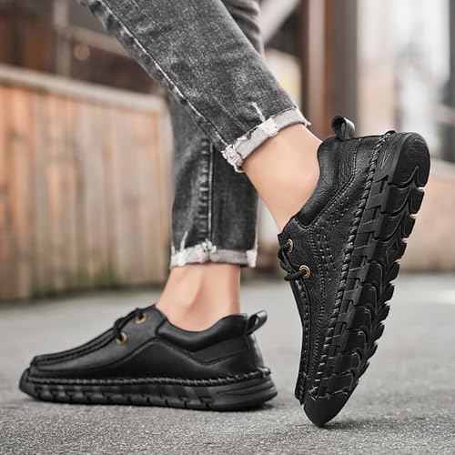 Men's Genuine Leather Lace Up Platform Loafers Hand Stitching Casual Comfortable Anti-Slip Soft Bottom Slip-on Loafers Outdoor Driving Walking Shoes 6