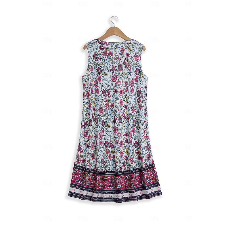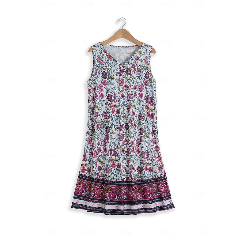 Highlights [Fabric]: Crafted from high-quality polyester, this Women's Tank Dress offers a lightweight, breathable feel, ideal for spring and summer seasons. The micro-elastic fabric ensures a comfortable fit that allows for easy movement throughout your day. [Silhouette]: The dress boasts a relaxed A-line shape that flatters a variety of body types. Its loose fit enhances comfort and style, providing a breezy feel perfect for warm weather outings. [Design Highlights]: Featuring a charming ditsy floral print, this dress combines vibrant pink and red flowers against a white background for a visually appealing look. The V-neckline adds a touch of elegance, while the sleeveless design keeps the feel casual and comfortable. A contrasting border at the hem with intricate patterns in shades of purple and red adds a sophisticated detail. [Occasions]: Perfect for various occasions such as street outings, holidays, daily activities, going out, and weekend getaways. This versatile piece is an excellent choice for casual outings, beach holidays, or garden parties, adding a stylish touch to your summer wardrobe. [Size Range]: Available in sizes S, M, L, XL, XXL, and 3XL, this dress suits a wide range of body types. For a comfortable fit, it is suggested to select one size larger than your usual size.