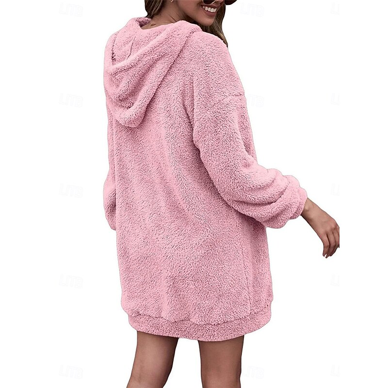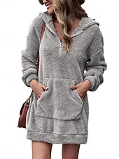 Highlights [Fabric] : Crafted from a plush blend of polyester and fleece, this hoodie dress offers a cozy, teddy bear texture that is both comfortable and on-trend. The micro-elastic properties of the fabric provide a gentle stretch, ensuring ease of movement and all-day comfort. [Fit] : Featuring a regular fit, this dress is designed for a relaxed and loose silhouette, offering ample room for movement without compromising style. The mini dress length adds a youthful touch to the overall casual aesthetic. [Design Highlights] : This hoodie dress boasts several stylish elements, including a practical kangaroo pocket at the front for small essentials or keeping your hands warm. The dress also includes a hoodie with an adjustable drawstring for a customizable fit and a quarter-zip closure at the neckline, providing a modern and versatile edge. [Occasions] : Ideal for a variety of settings, this dress is perfect for sports and outdoor activities, casual streetwear, or even lounging at home. Its chic yet casual style makes it suitable for running errands or enjoying laid-back outings with friends. [Size Range] : Available in a wide range of sizes from S to 2XL, ensuring a comfortable and flattering fit for different body types. Whether you prefer a snug or roomy fit, there’s a size to suit your style.