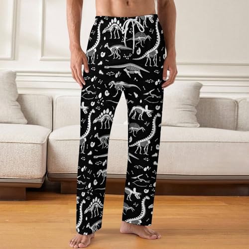 HOT ! Black White Dinosaur Skeleton Print Mens Pajama Pants Wide Leg Sleep Drawstring Sleepwear Casual Loungewear