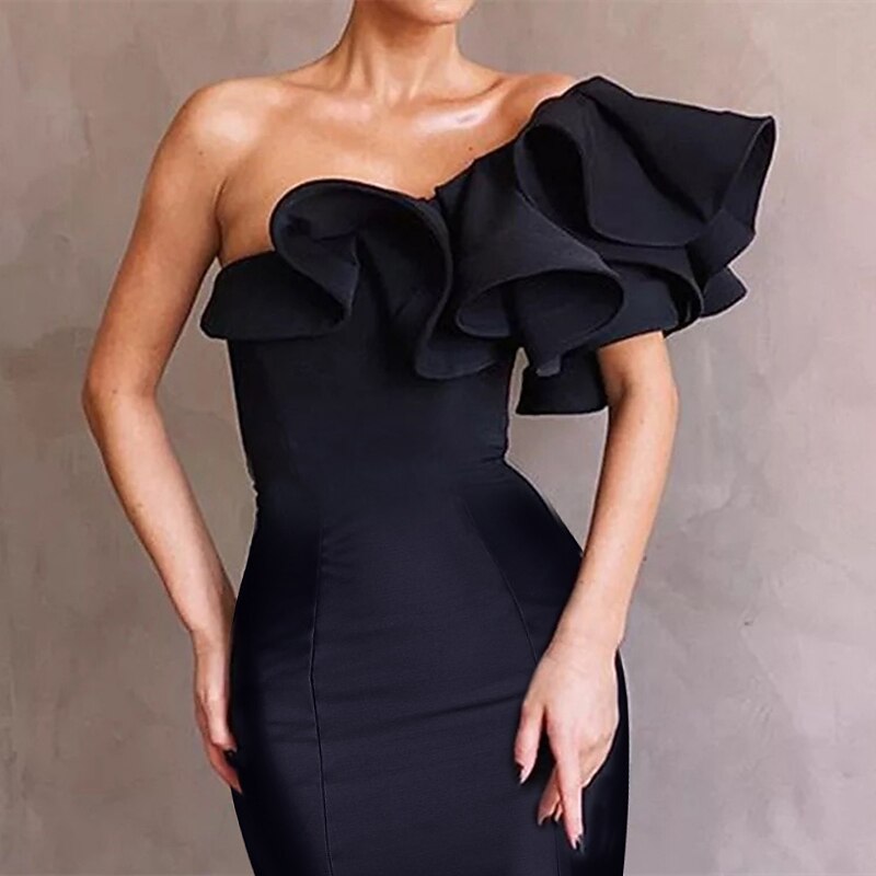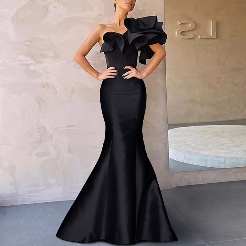 HOT ! Mermaid Evening Gown Corsets Dress Formal Wedding Guest Floor Length Sleeveless One Shoulder Taffeta with Ruffles Shouder Flower Masquerade Dress