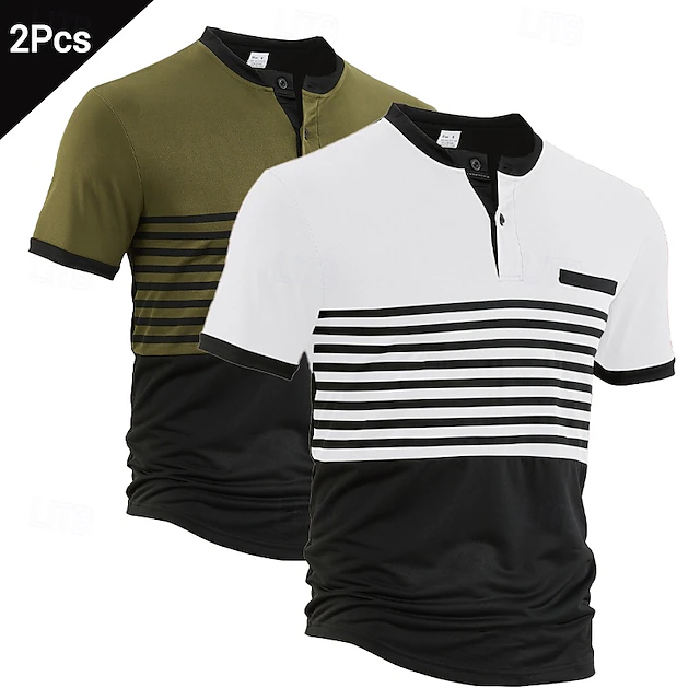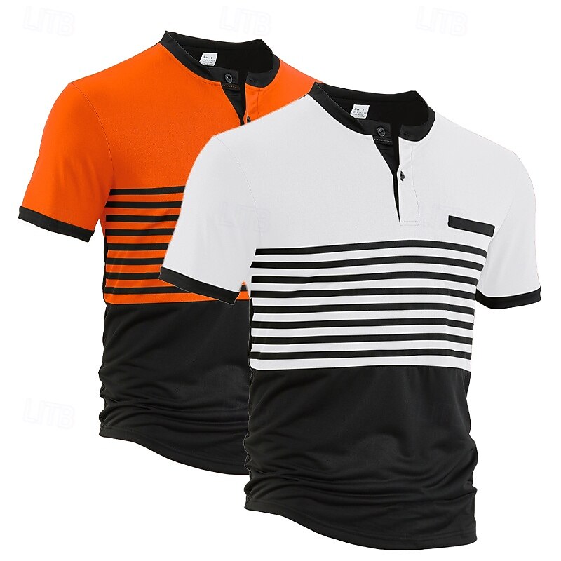 Multi Packs 2pcs Men's Stand Collar Short Sleeves White+Orange Button Up Polos Golf Shirt Golf Polos Shirts Buttons Stripe Vacation Daily Wear Polyester Summer 2