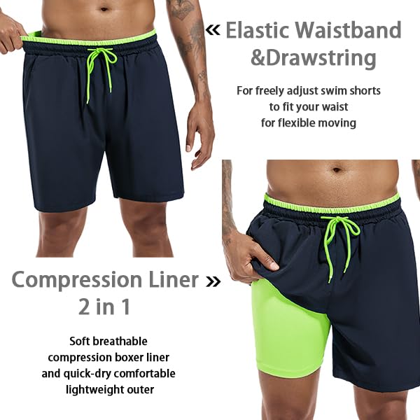 • 2 in 1 Simming Shorts:The mesh linning adds an extra layer of comfort and prevents chafing, making them ideal for all-day wear.The Shorts with compression liner provides more comfortable that you will don't feel the tight,but also protects your skin from scratches and prevent discomfiture from sticking to the skin once the shorts get soaked.