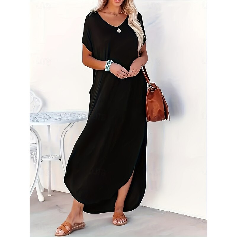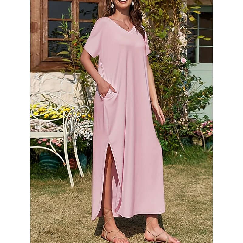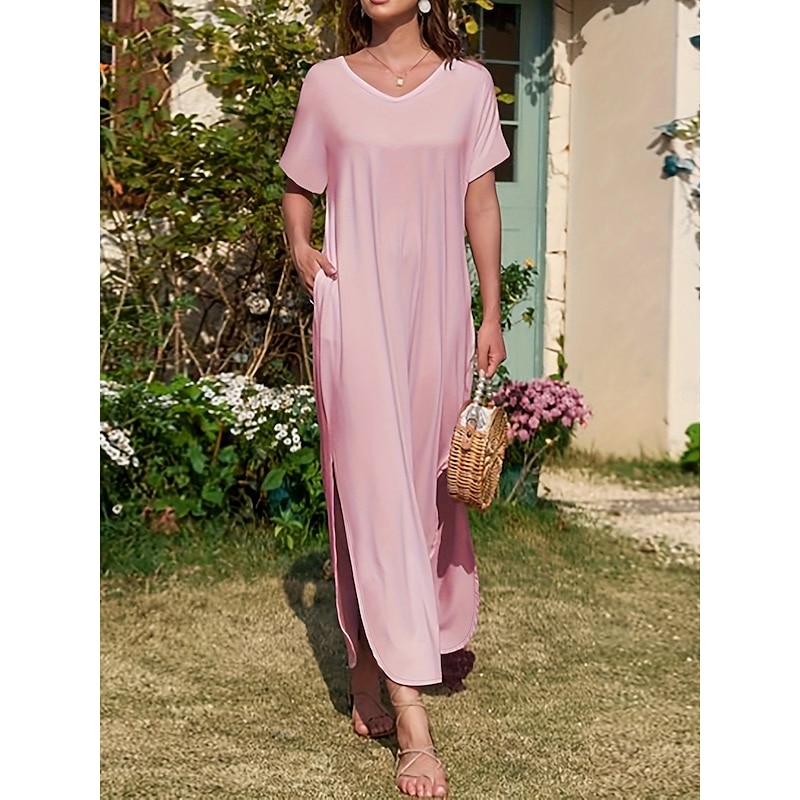 Women's Maxi Dress Summer Dress Casual Daily Regular Fit Plain Short Sleeve V Neck Black Pink Green Summer 12