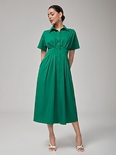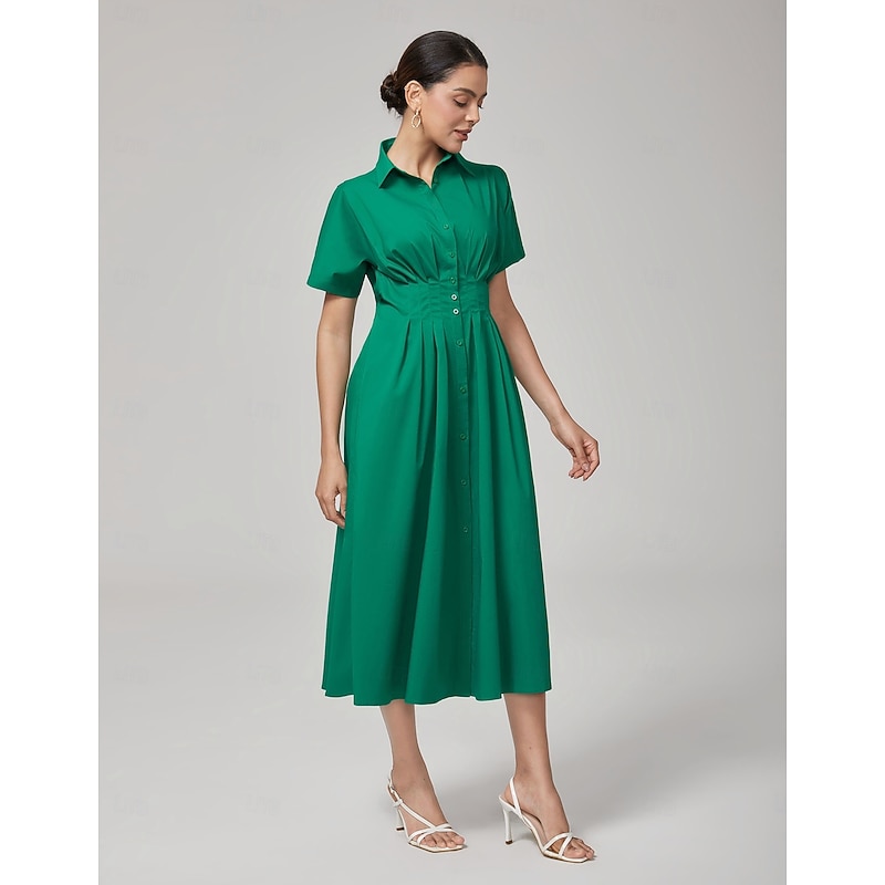 Women's Maxi Dress Vintage Green Cotton Pleated Waist Shirt Collar Casual Elegant Spring Summer Fall
