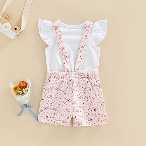 Toddler Baby Girl Overalls Ruffle Sleeve T-Shirt Top Floral Suspender Short Pants Little Kids Summer Clothes Set 2