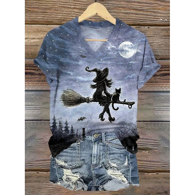 More information about Halloween Women's T shirt Witch Graphic Vintage Stylish Classic Short Sleeve Crew Neck Regular Tops Daily Weekend Print Sage Green Yellow Blue Orange Gray Summer Spring Fall
