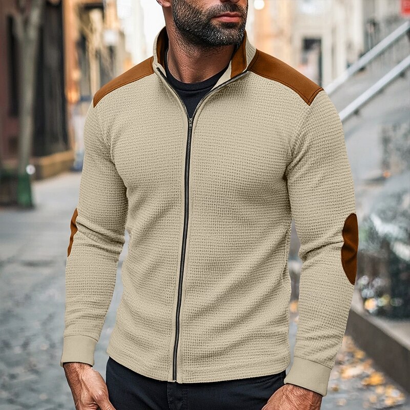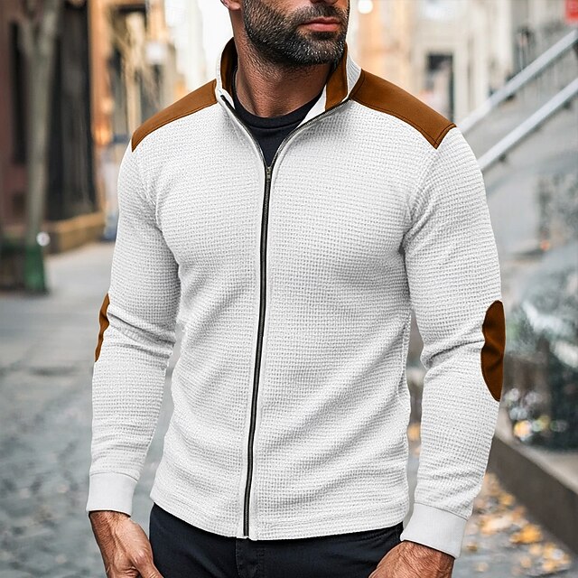 More information about Men's T Shirt Jacket Waffle Knit Tee Tee Top Long Sleeve Standing Collar Fall Spring & Fall Color Block Fashion Designer Basic Zip Up Patchwork Vacation Street Casual White Navy Blue khaki Top Tee
