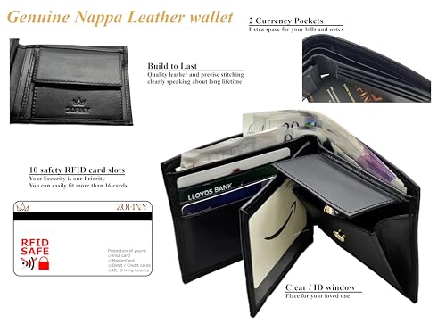 HOT ! Nappa Leather Bifold Wallet with Coin Pocket for Men - 2 Spacious Cash Compartments, 11 Card Slots with RFID protection, Driving Licence Window, High-end Finish