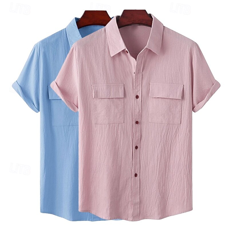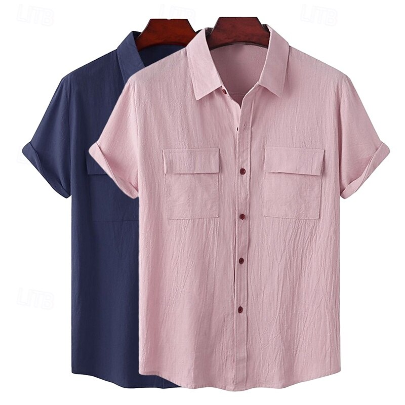 Men's Shirt Linen Shirt Summer Shirt Beach Wear Button Up Shirt Plain Vacation Casual White+Green Green+pink White+Navy Blue Pink+Navy Blue Short Sleeve Turndown Summer Clothing Apparel Multi Pocket 5