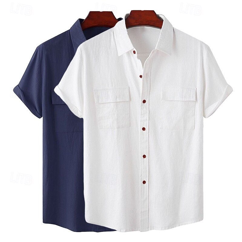 Men's Shirt Linen Shirt Summer Shirt Beach Wear Button Up Shirt Plain Vacation Casual White+Green Green+pink White+Navy Blue Pink+Navy Blue Short Sleeve Turndown Summer Clothing Apparel Multi Pocket 20