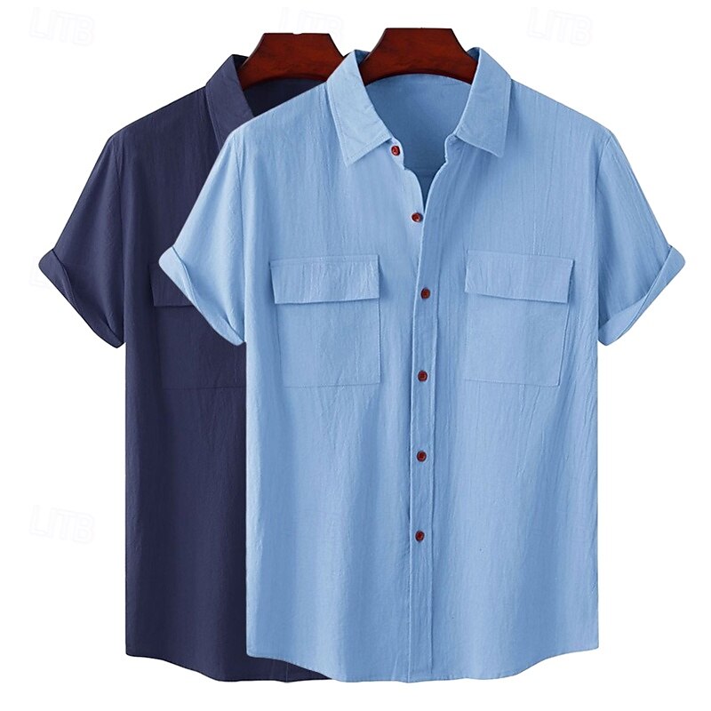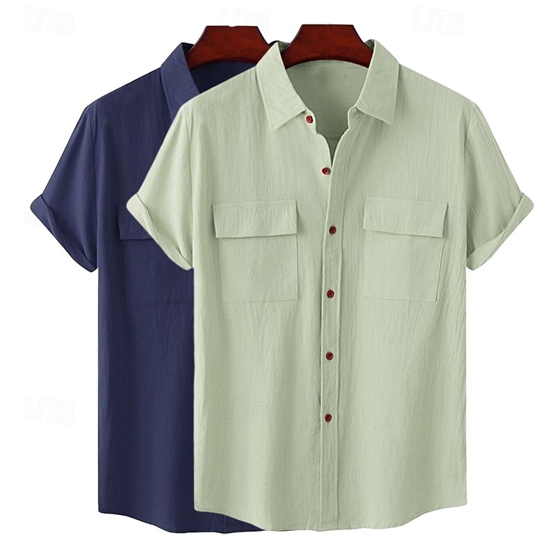 HOT ! Men's Shirt Linen Shirt Summer Shirt Beach Wear Button Up Shirt Plain Vacation Casual White+Green Green+pink White+Navy Blue Pink+Navy Blue Short Sleeve Turndown Summer Clothing Apparel Multi Pocket