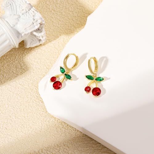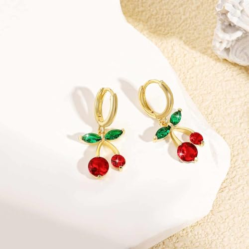 HOT ! Cherry Earrings for Women Cherry Jewelry Gold Dangle Hoop Earring Green Red Dainty Lightweight Hypoallergenic Earrings 3D Fruit Charm Strawberry Aesthetic Jewelry Cherry Gifts for Women Non Tarnish