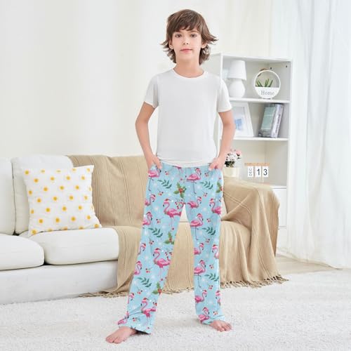 HOT ! Merry Christmas Flamingo Berry Boys Long Pants Soft Trousers Elastic Waist Kids Lounge Bottoms with Pockets S-XL