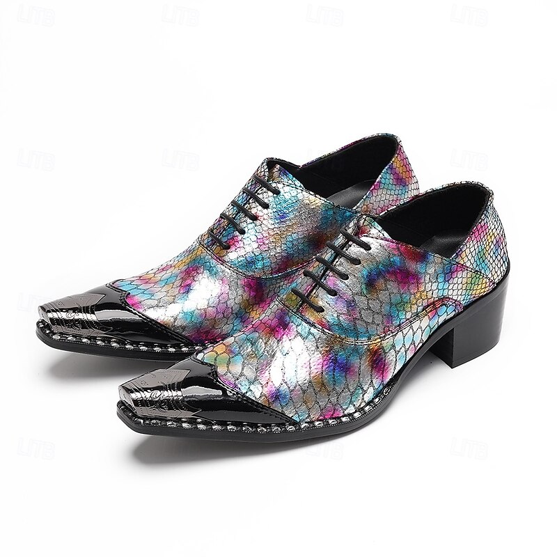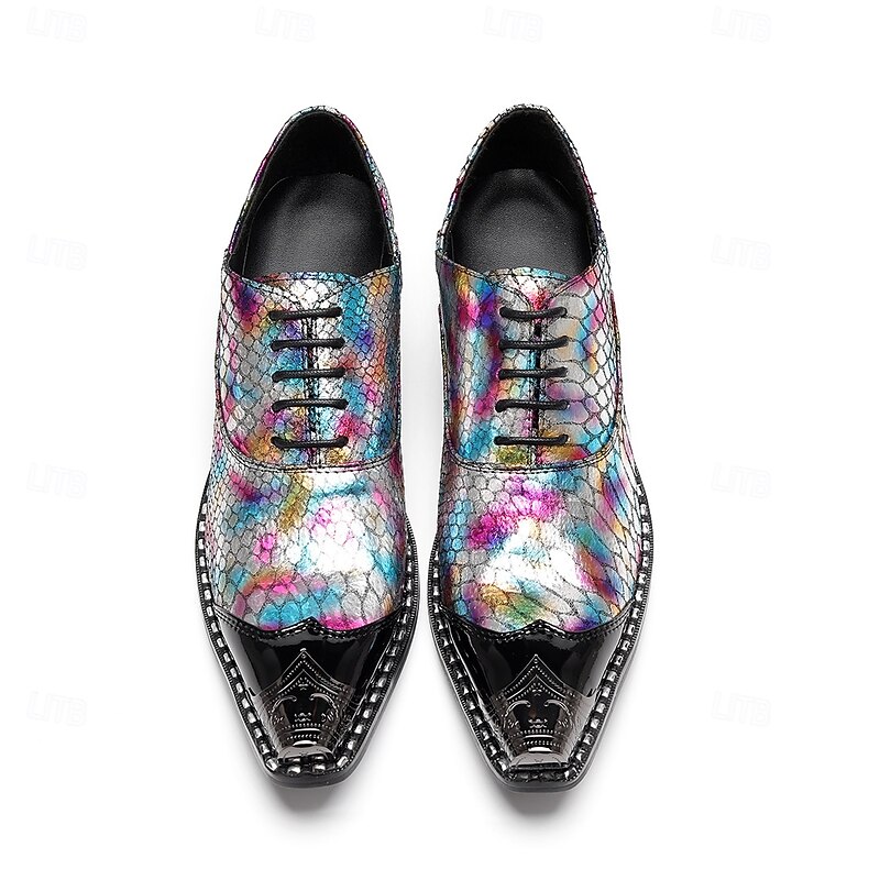 Men's Iridescent Genuine Leather Oxford Shoes with Crocodile Pattern and Pointed Toe, Cowhide Dress Shoes for Stage, Parties and Fashion Events 12