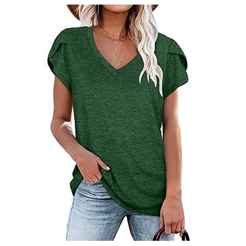 Highlights [Fabric] : Crafted from a soft cotton blend, this women's T-shirt offers breathability and comfort, making it ideal for daily wear during the warmer months. The lightweight fabric ensures a relaxed experience, perfect for all-day comfort. [Style] : This basic V-neck T-shirt features a casual yet chic silhouette with cap sleeves, providing a classic look that is both simple and elegant. The loose, slightly draped sleeves add a subtle touch of sophistication, enhancing the overall casual style. [Design Highlights] : Available in a variety of solid colors such as green, black, purple, white, and grey, this T-shirt can be effortlessly styled to suit different moods and occasions. Its versatile design makes it easy to pair with jeans or shorts for a relaxed, laid-back outfit. [Occasions] : Perfect for everyday activities and casual outings, this T-shirt is suitable for both daily wear and going out, making it a staple in any wardrobe. [Size Notice] : The T-shirt comes in a range of sizes including S, M, L, XL, and XXL, ensuring a fit that caters to different body shapes and preferences.